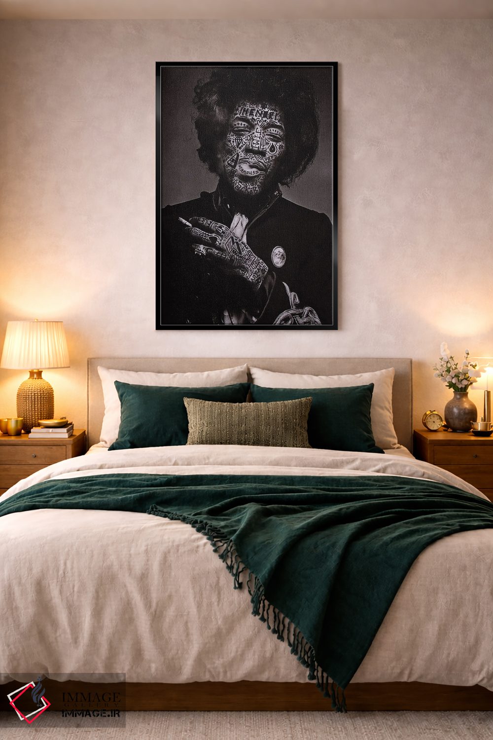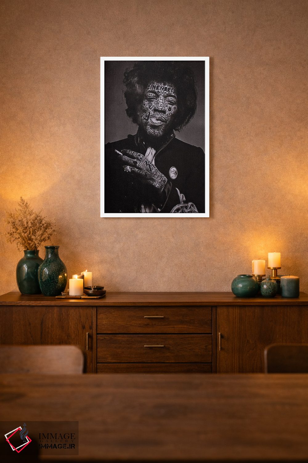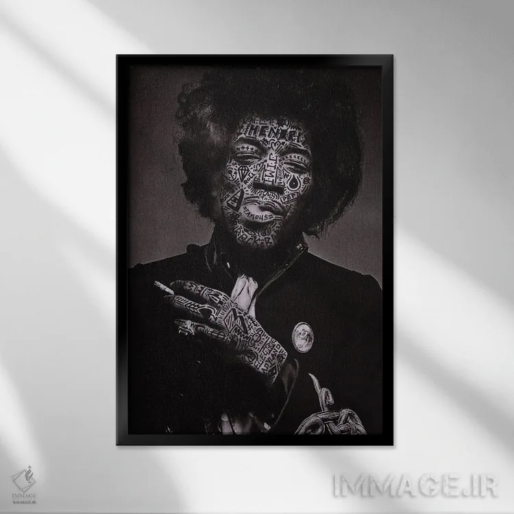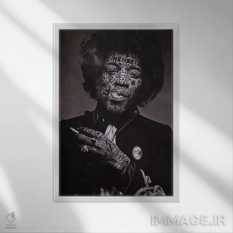 در «جیمی (احتمالاً اشاره به Jimi Hendrix)» اثرِ «آر.اس. آرتیست (هنرمند با نام اختصاری)»، تاکید بر هویت و بیان تصویری باعث میشود در چیدمانهای مدرن هم تاثیرگذار بماند.