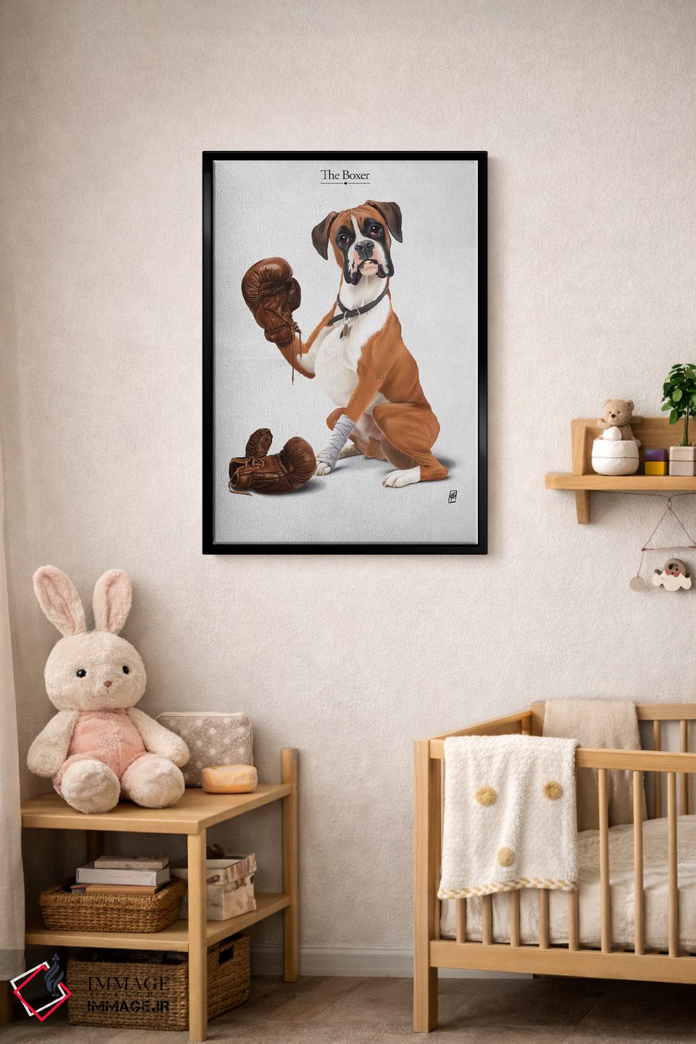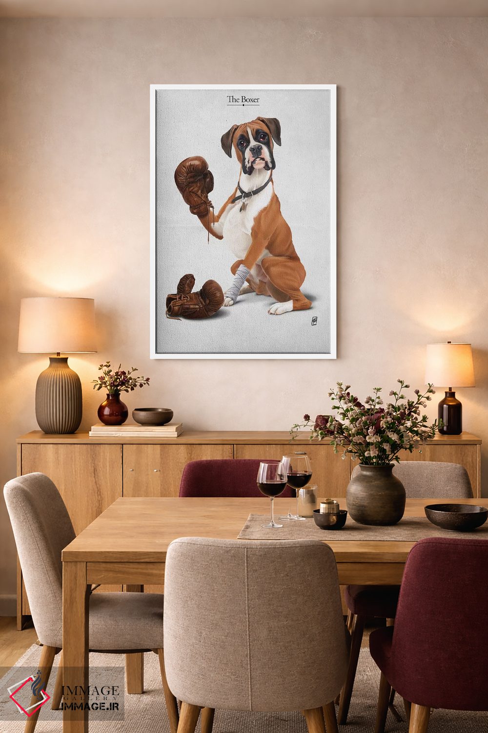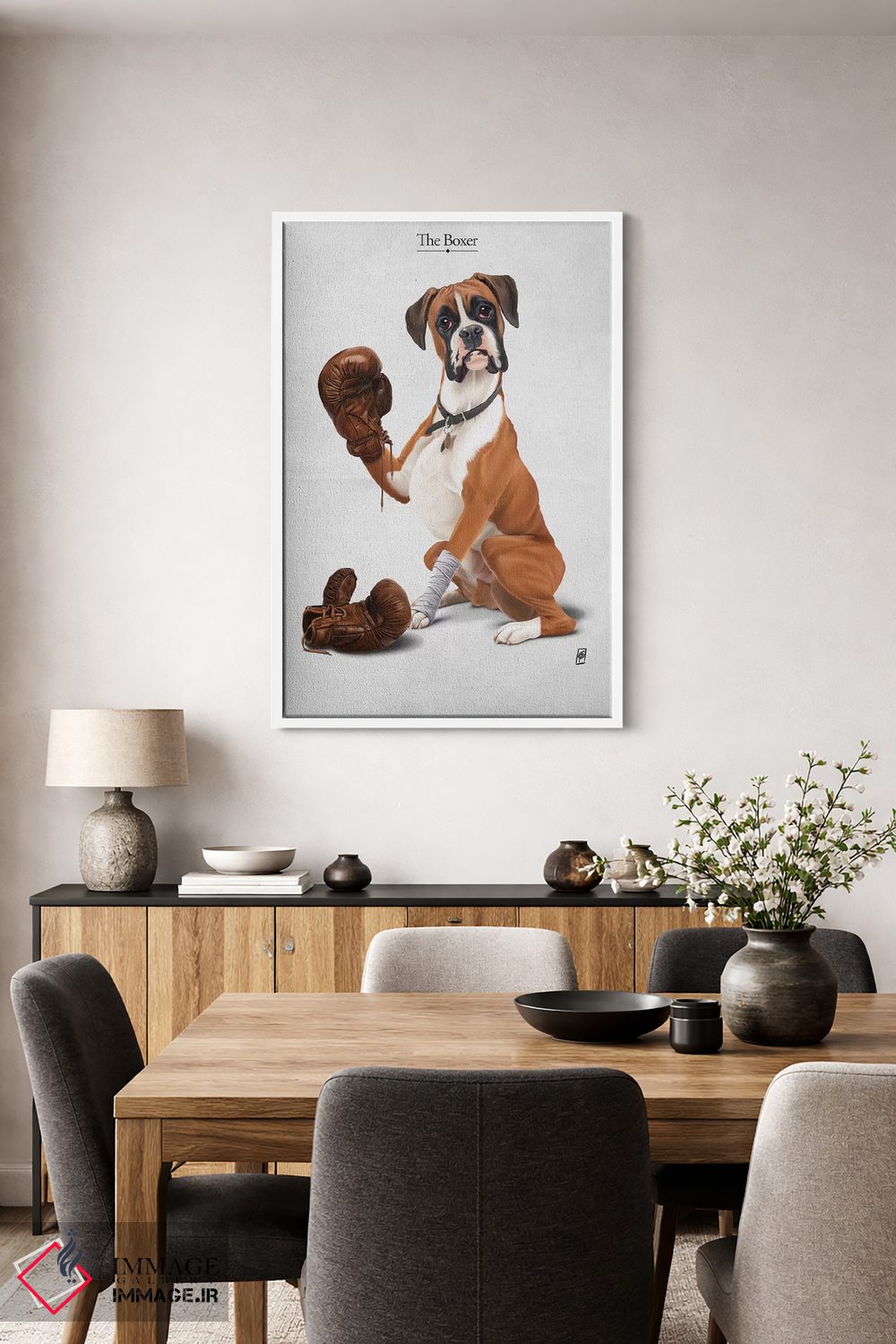 در «بوکسور I» اثرِ «راب اسنو»، حضور حیوانات به دیوار، انرژیِ نرم و زنده میدهد؛ برای فضاهای روستیک یا بوهو انتخابی خوشسلیقه است. در کنار گیاهان و نور طبیعی، جذابتر هم میشود.