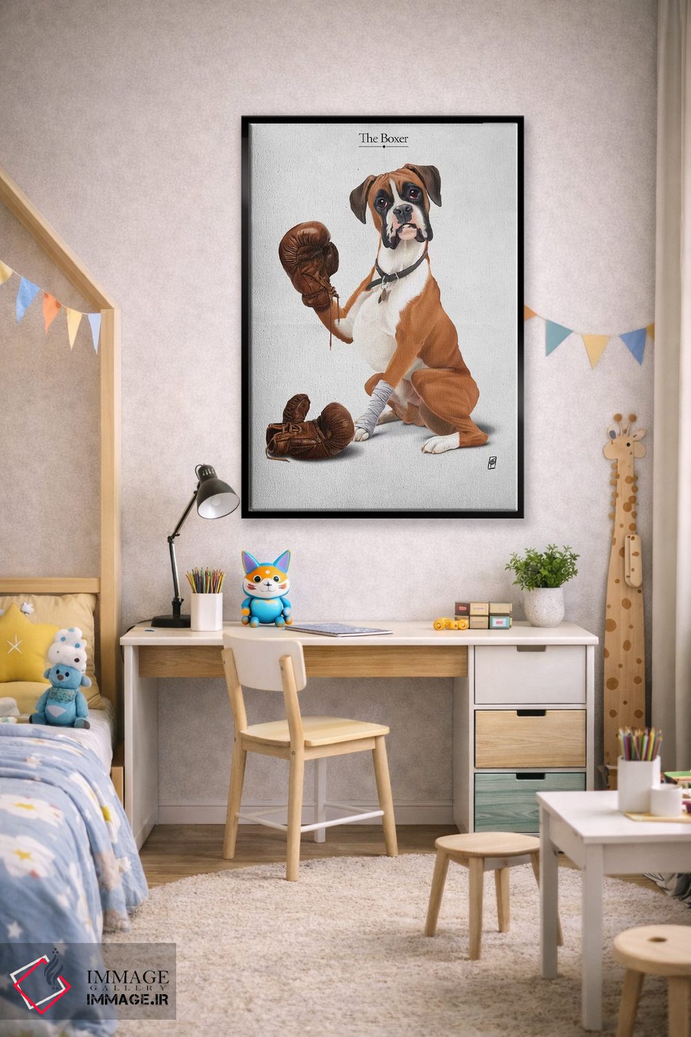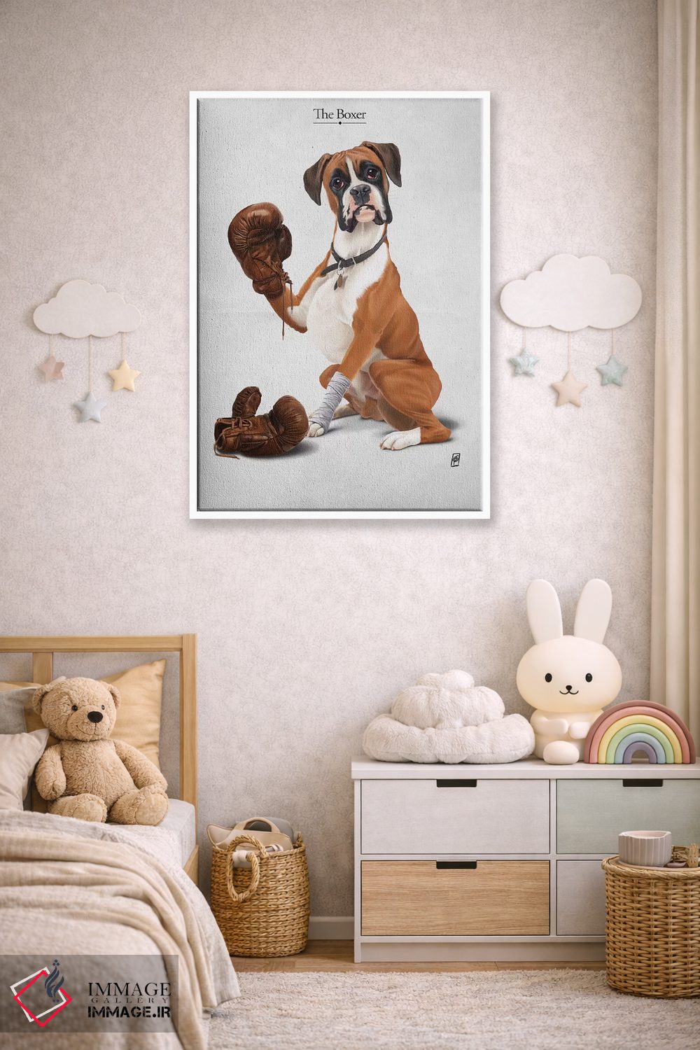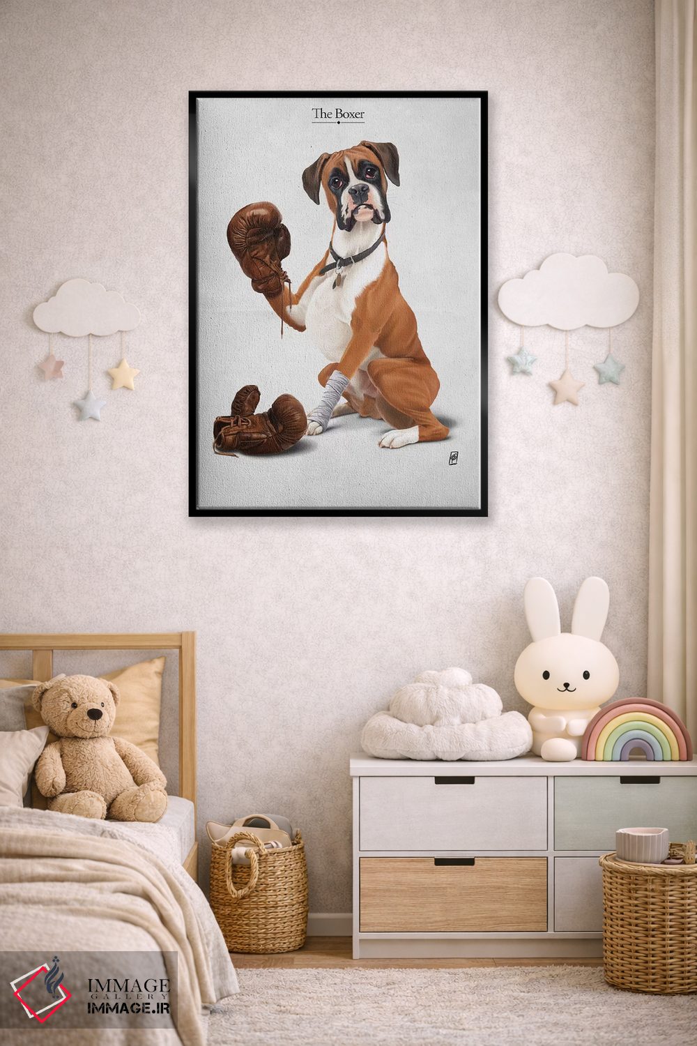 در «بوکسور I» اثرِ «راب اسنو»، حضور حیوانات به دیوار، انرژیِ نرم و زنده میدهد؛ برای فضاهای روستیک یا بوهو انتخابی خوشسلیقه است. در کنار گیاهان و نور طبیعی، جذابتر هم میشود.