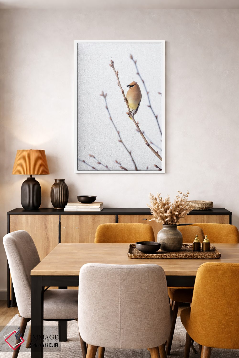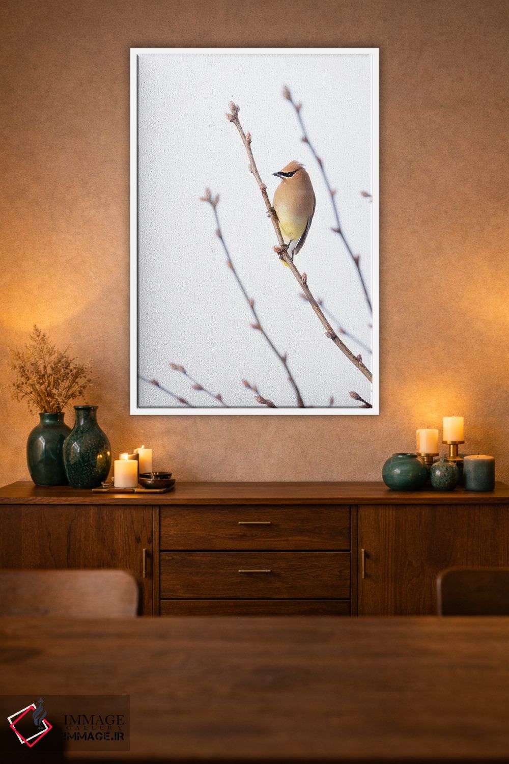 براساس پالت گرم اثر، قاب تیک گرم (چوبی) پیشنهاد اول است و مشکی مات (فریم متوسط) مکمل. برای سفارشهای پروژهای با ابعاد و قابهای اختصاصی با ایماژ در تماس باشید.