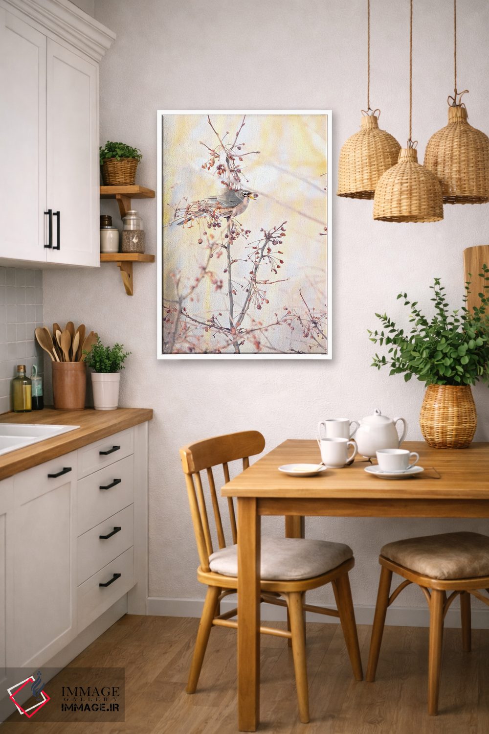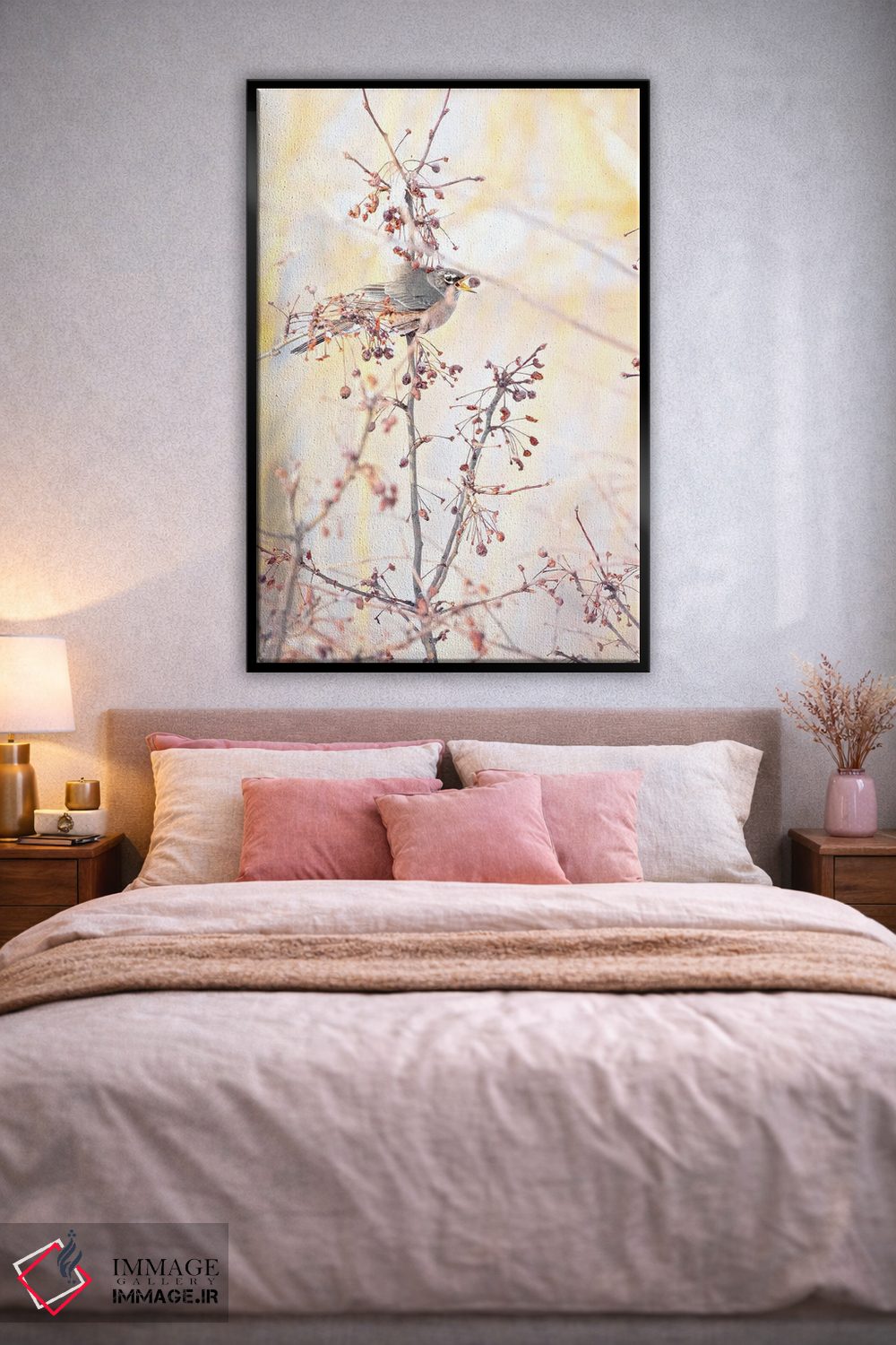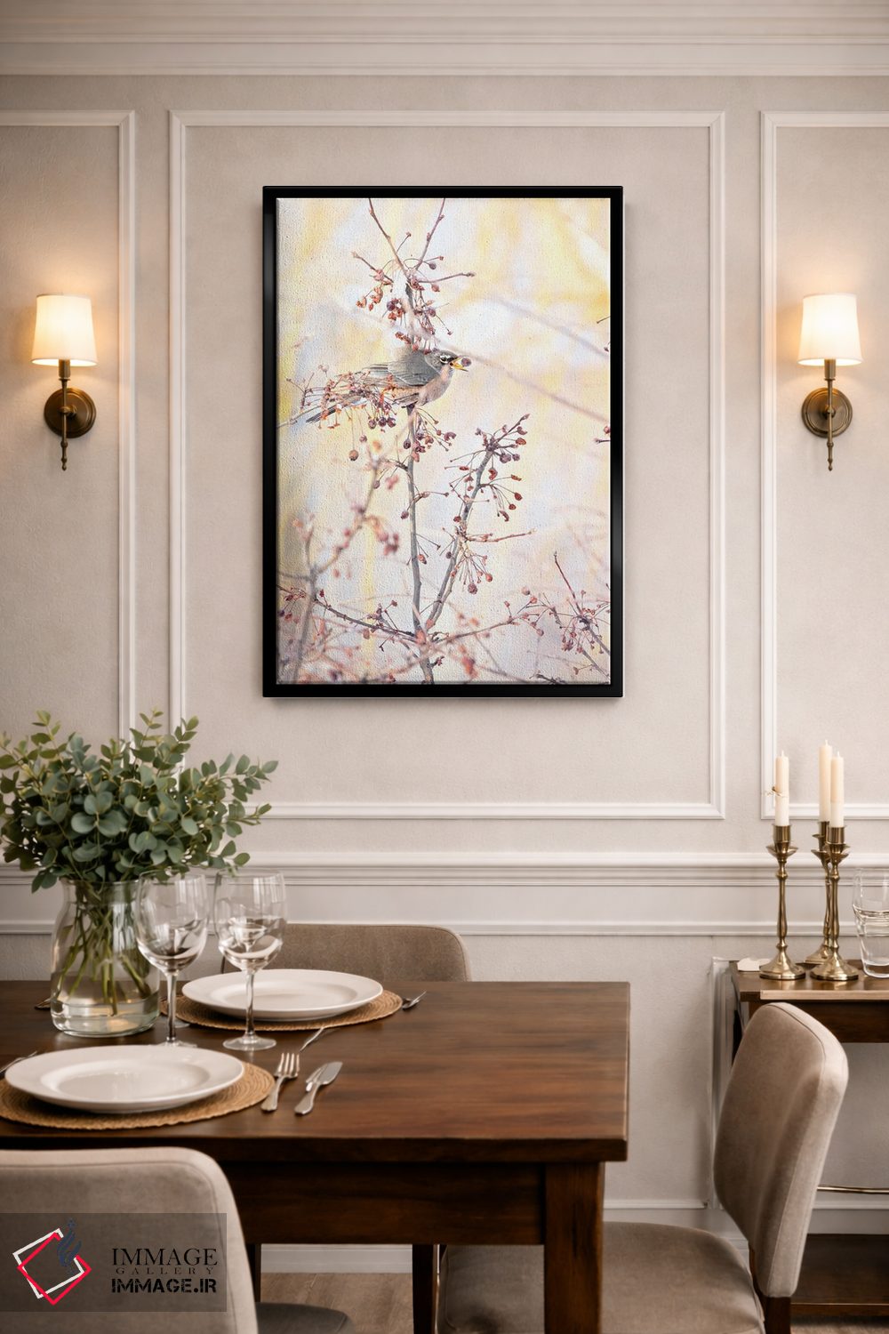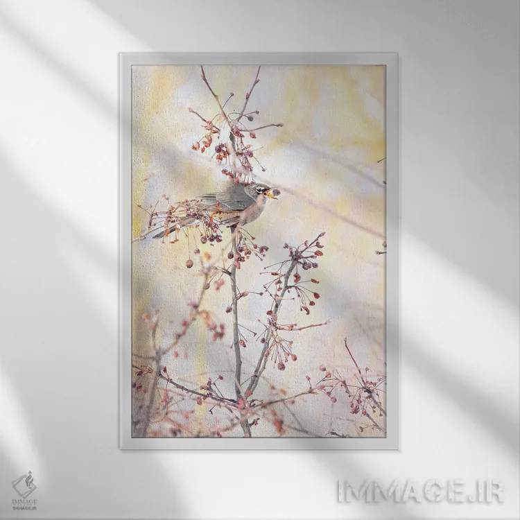 براساس پالت گرم اثر، قاب بلوط روشن (چوبی) پیشنهاد اول است و استخوانی ملایم مکمل. برای سفارشهای پروژهای با ابعاد و قابهای اختصاصی با ایماژ در تماس باشید.