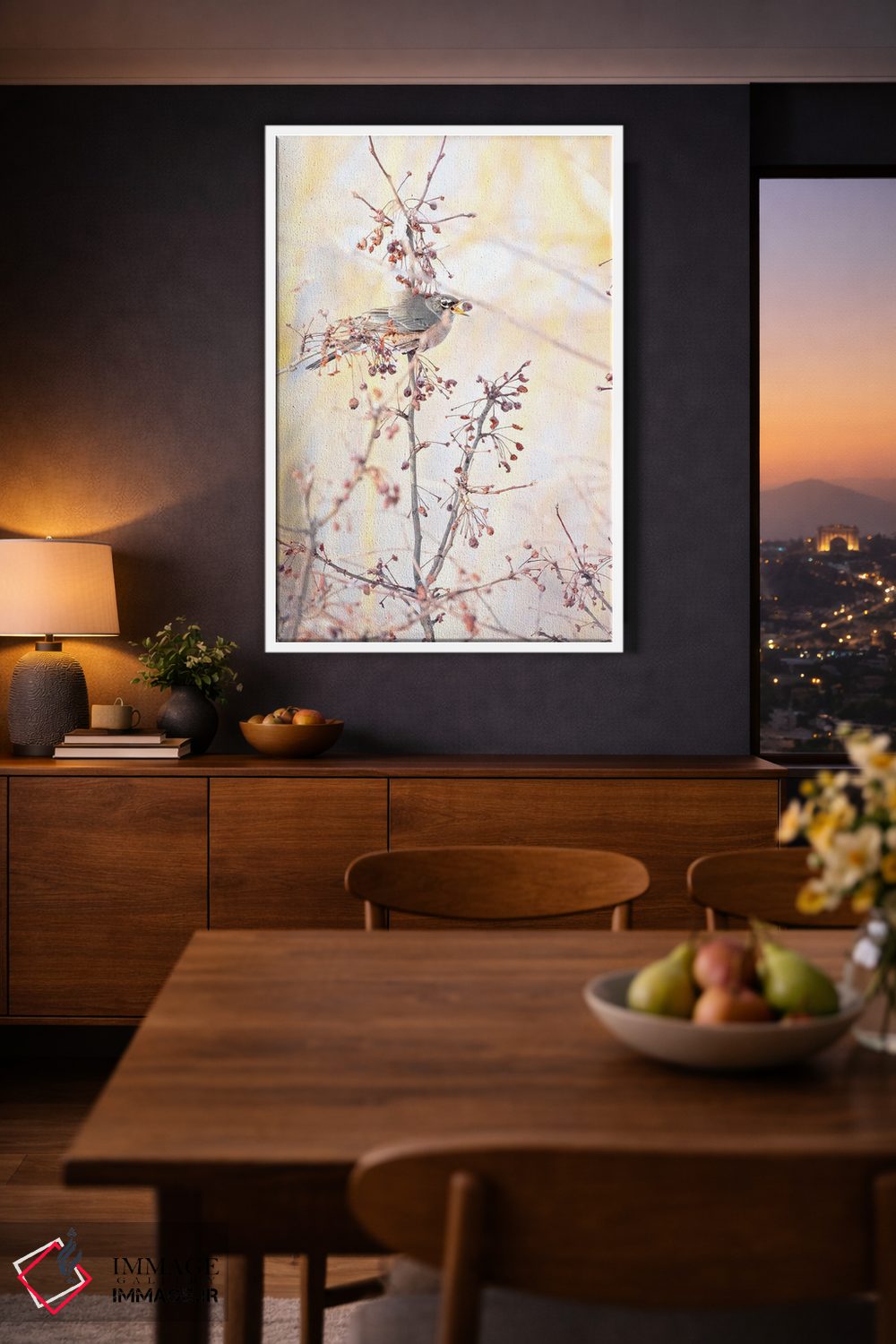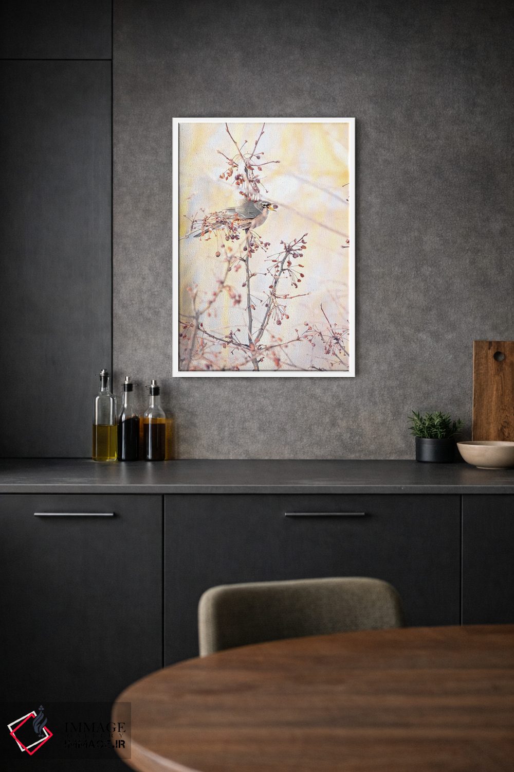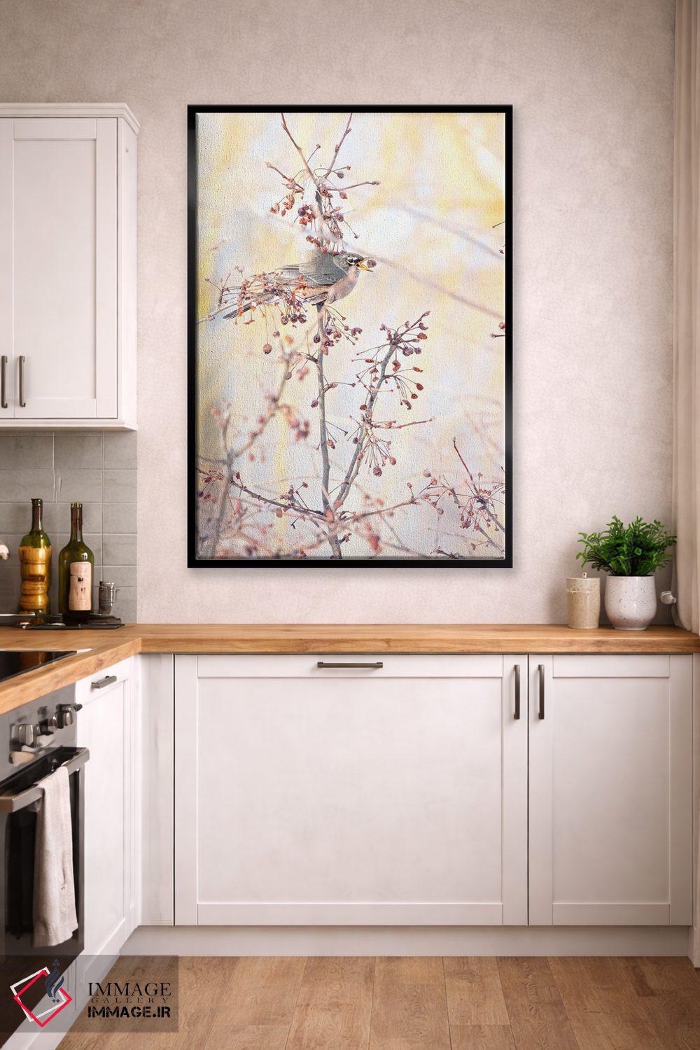 براساس پالت گرم اثر، قاب بلوط روشن (چوبی) پیشنهاد اول است و استخوانی ملایم مکمل. برای سفارشهای پروژهای با ابعاد و قابهای اختصاصی با ایماژ در تماس باشید.