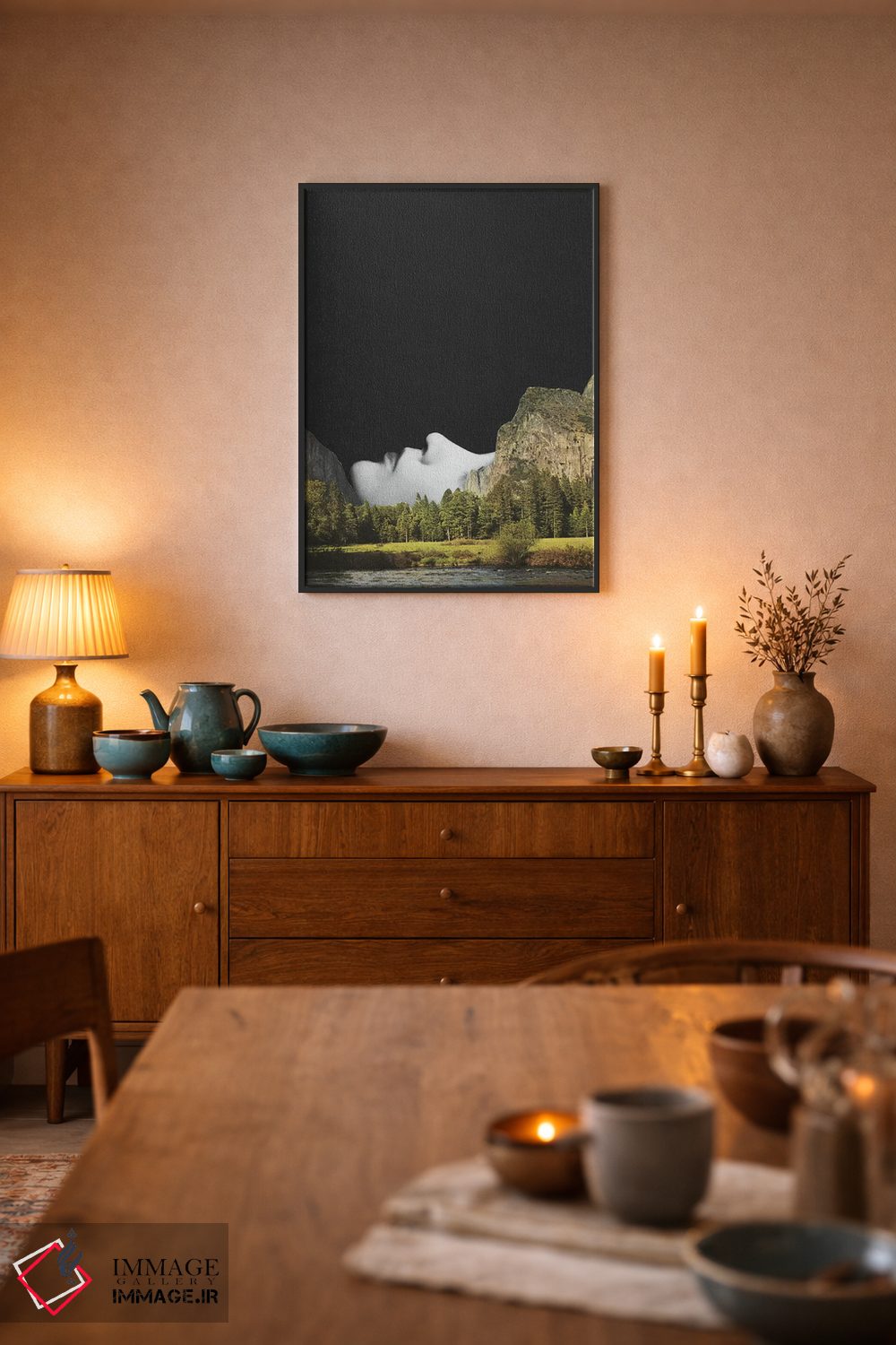 براساس پالت ترکیبی اثر، قاب تیک گرم (چوبی) پیشنهاد اول است و مشکی مات (فریم متوسط) مکمل. برای سفارشهای پروژهای با ابعاد و قابهای اختصاصی با ایماژ در تماس باشید.