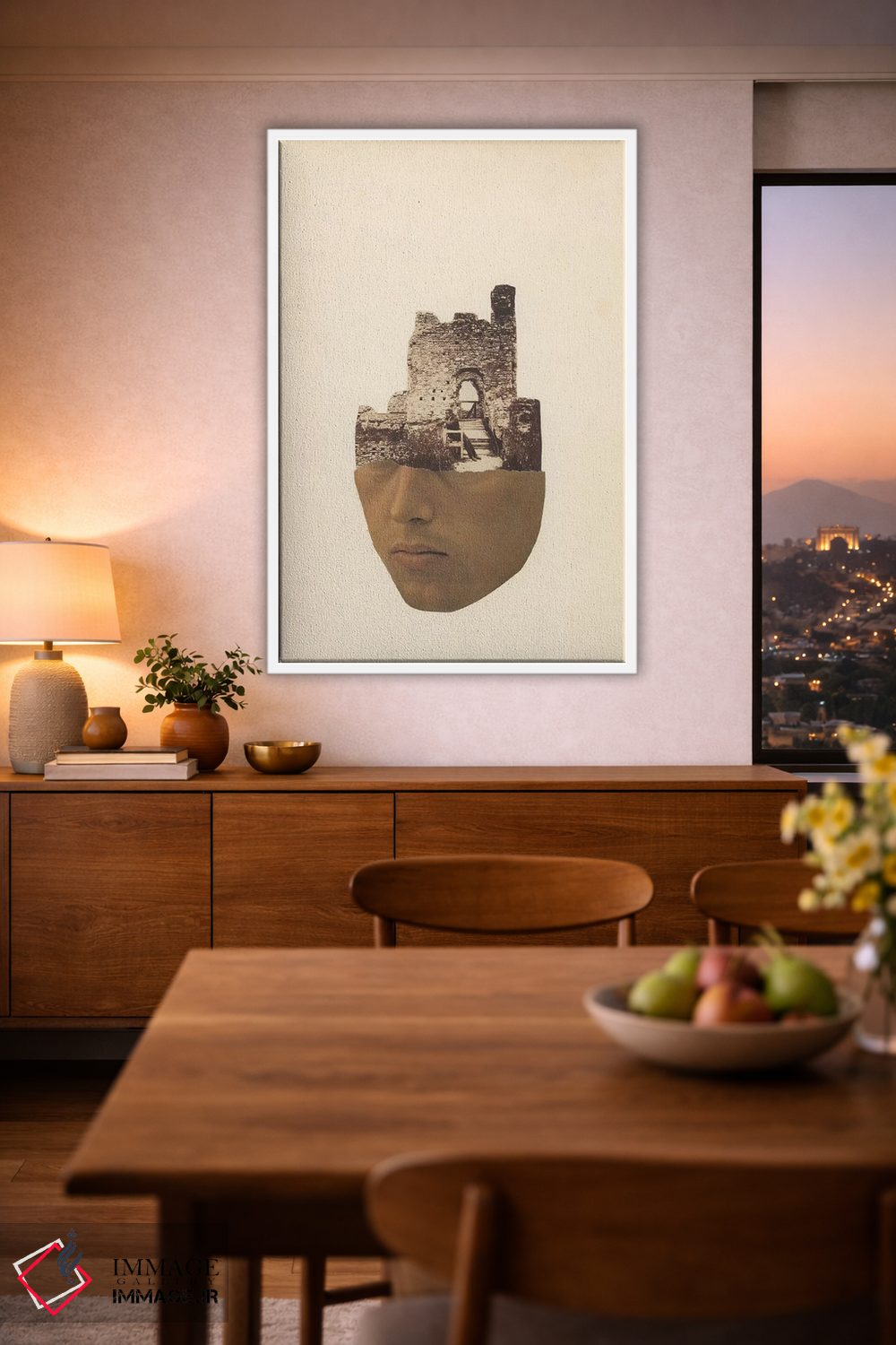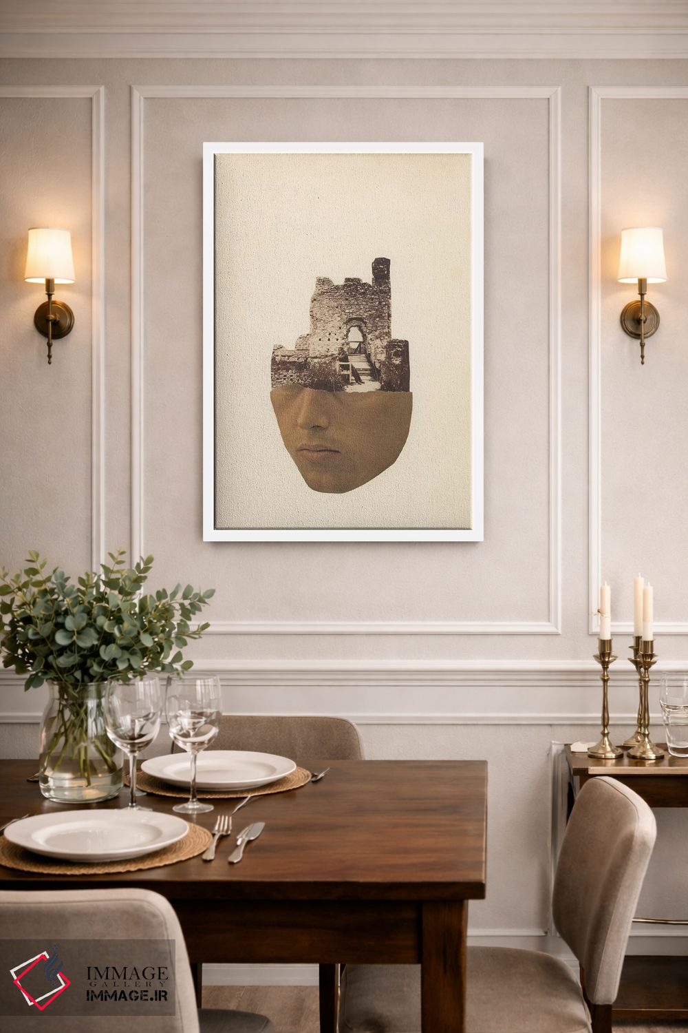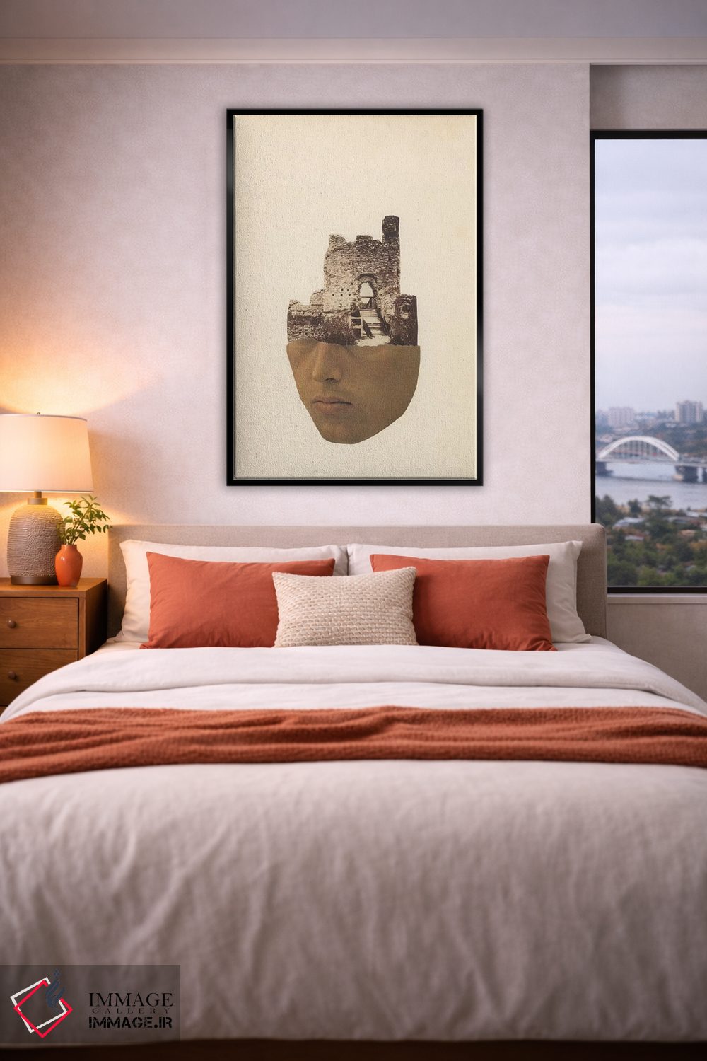 براساس پالت گرم اثر، قاب بلوط روشن (چوبی) پیشنهاد اول است و استخوانی ملایم مکمل. برای سفارشهای پروژهای با ابعاد و قابهای اختصاصی با ایماژ در تماس باشید.