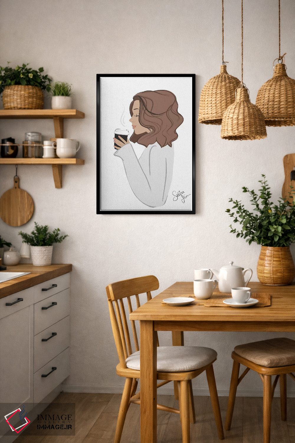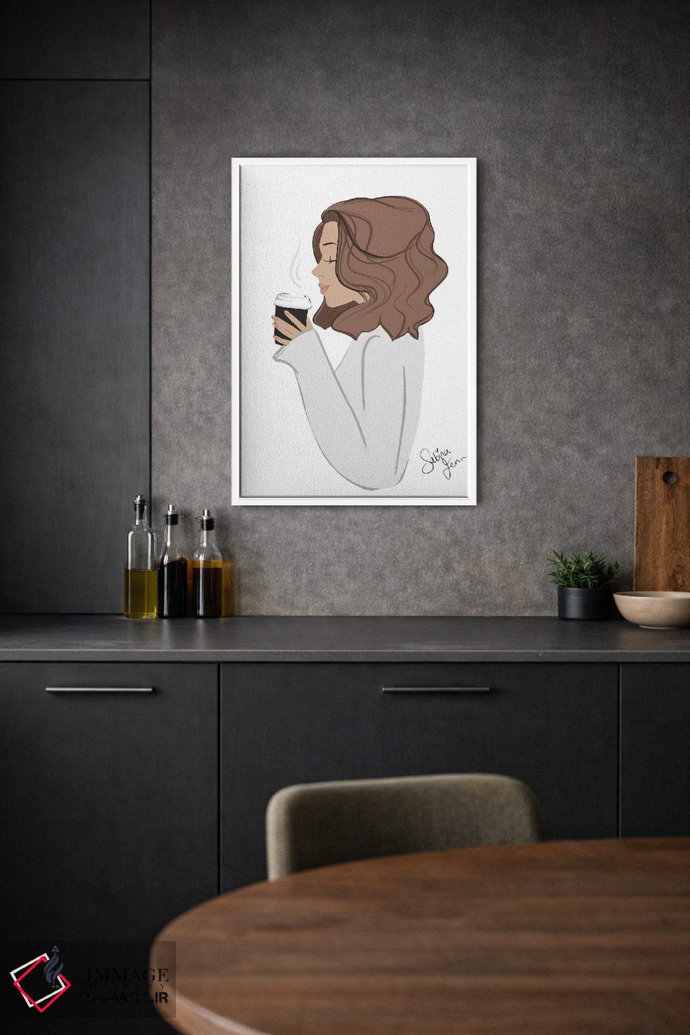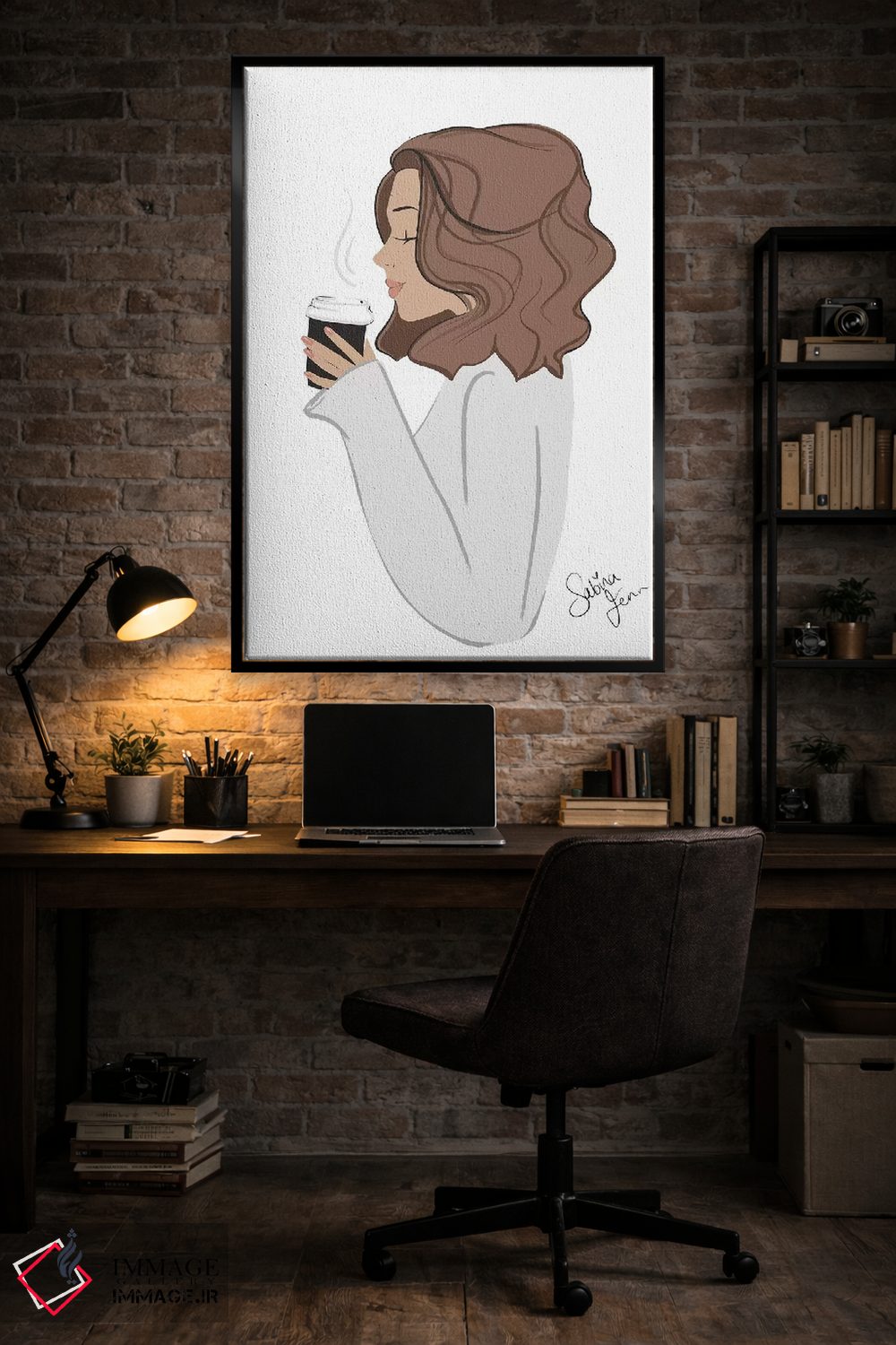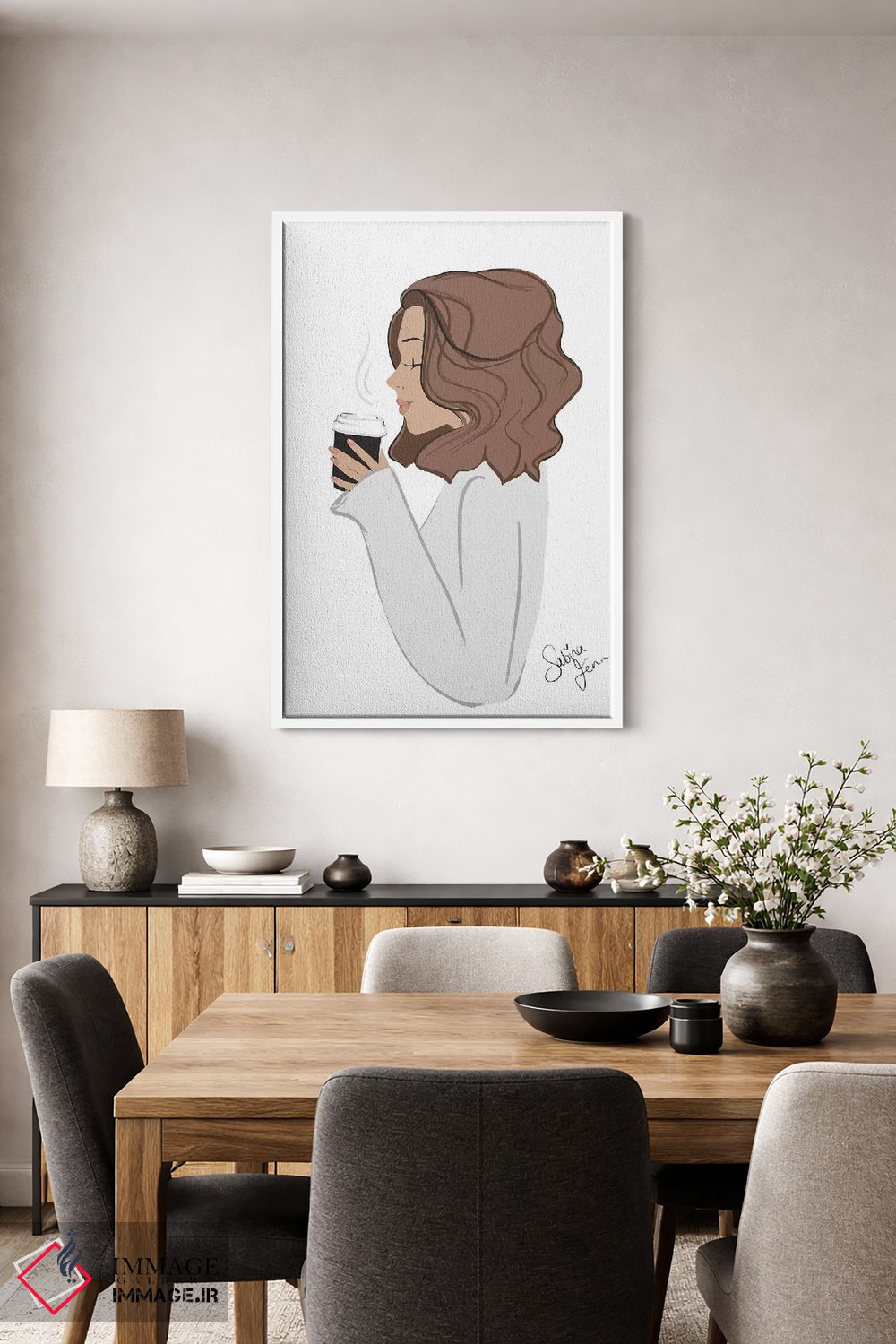 این تابلو با عنوان «Light—Skinned، Brunette Hair، استراحت قهوه، پوست روشن، موهای قهوهای» اثرِ «سابینا فن»، حسِ گرم و صمیمی به فضا میدهد.