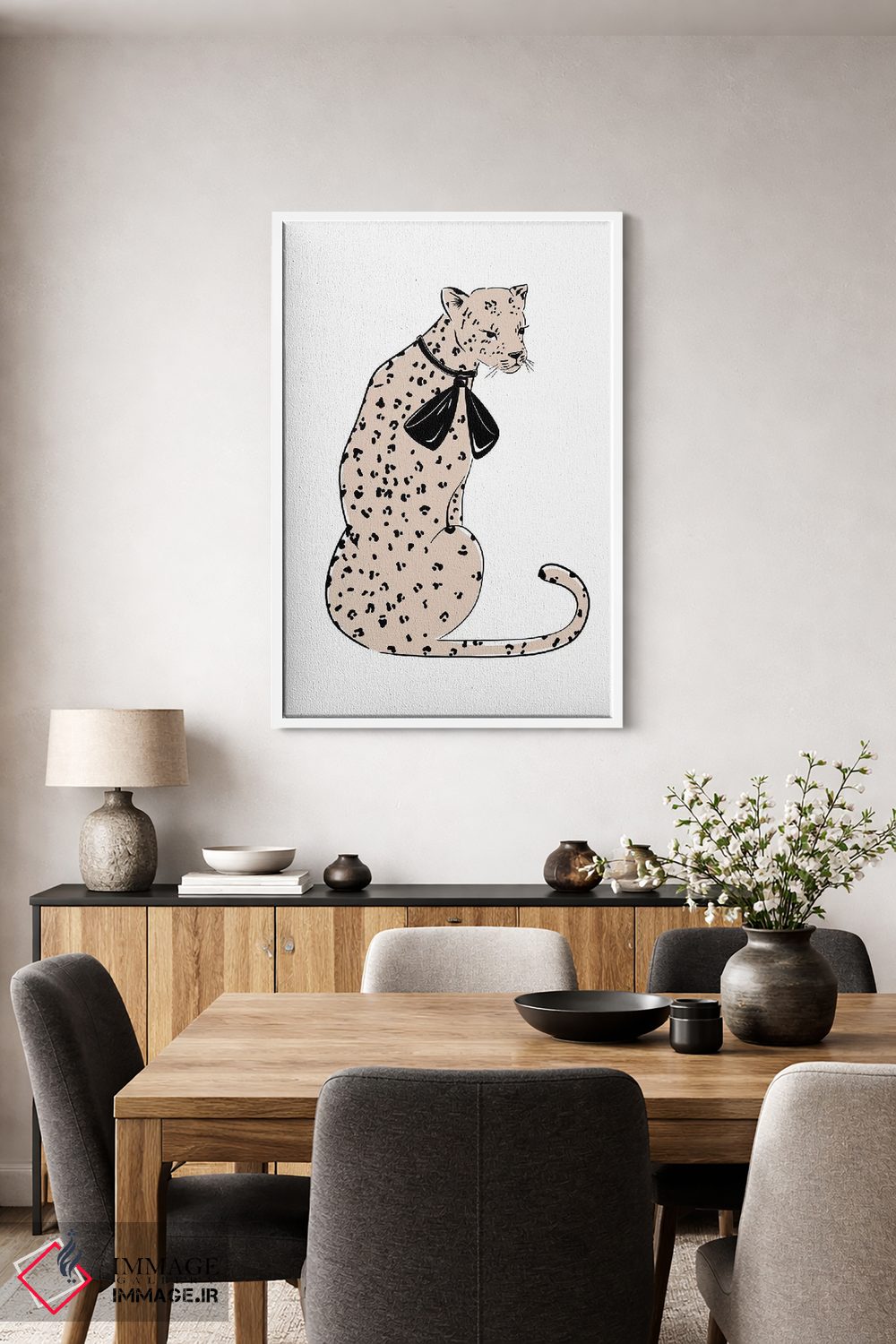 «شیک پلنگی (طرح پلنگی)» اثرِ «سابینا فن» از آن کارهاییست که بدون کودکانه شدن، بازیگوش و خوشپرداخت میماند؛ برای نشیمنهای خانوادگی انتخاب خوبیست. با قاب چوبی یا مشکی، حس مرتبتری پیدا میکند.
