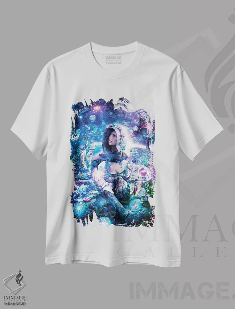 تیشرت سفید طرح دار مشاهدهٔ هم افزایی آسمانی ما، هنر فاخر معاصر اثر کامرون گری | immage.ir