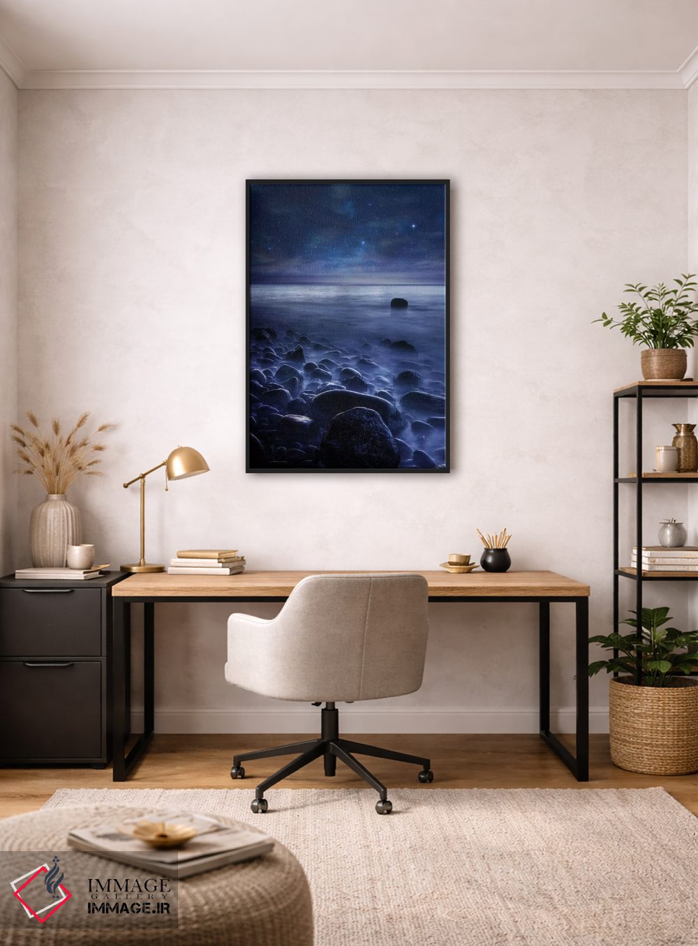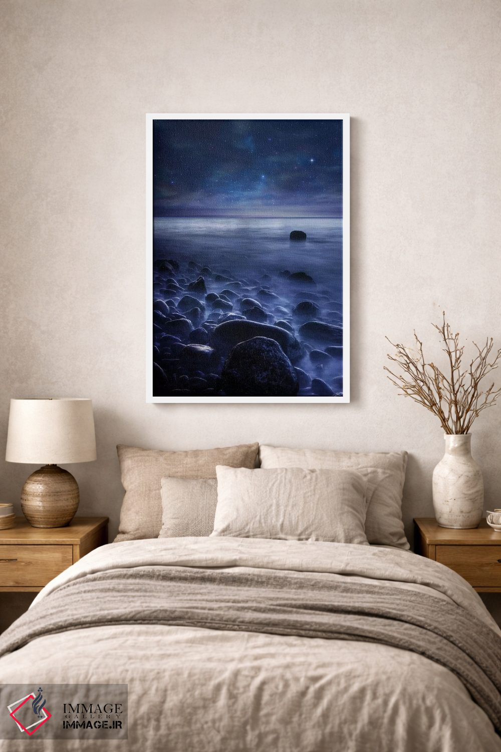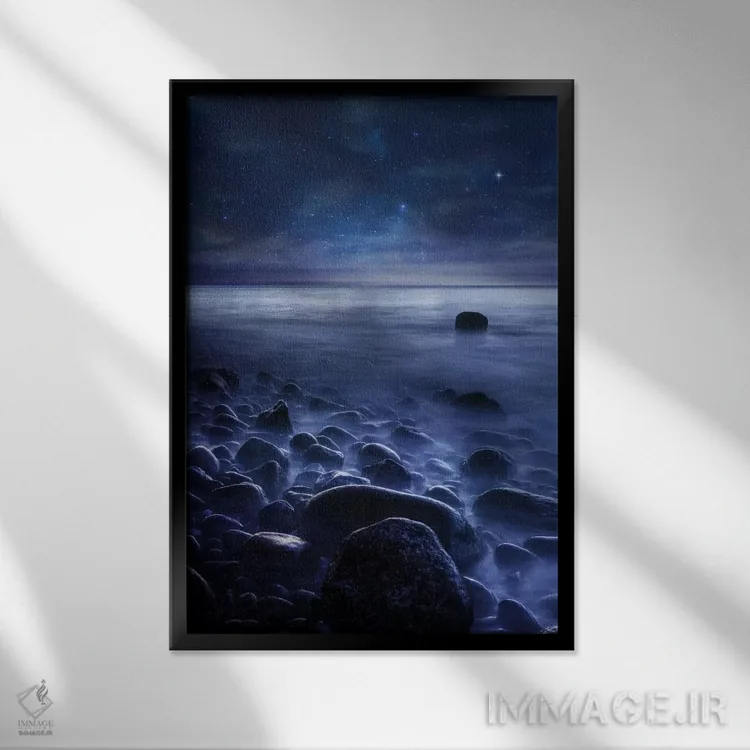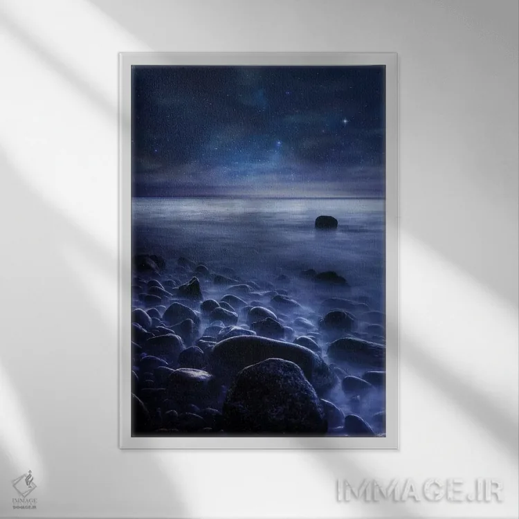 براساس پالت سرد اثر، قاب سفید مات (فریم باریک) پیشنهاد اول است و نقرهای برسخورده (متالیک) مکمل. برای سفارشهای پروژهای با ابعاد و قابهای اختصاصی با ایماژ در تماس باشید.