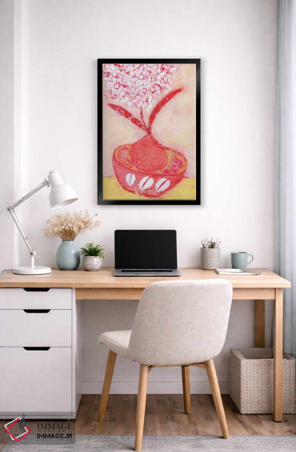 برای یک چیدمان تمیز، صورتی را در دستهگل خشک جا بدهید تا نگاه به سمت اثر هدایت شود. اغراق لازم نیست.