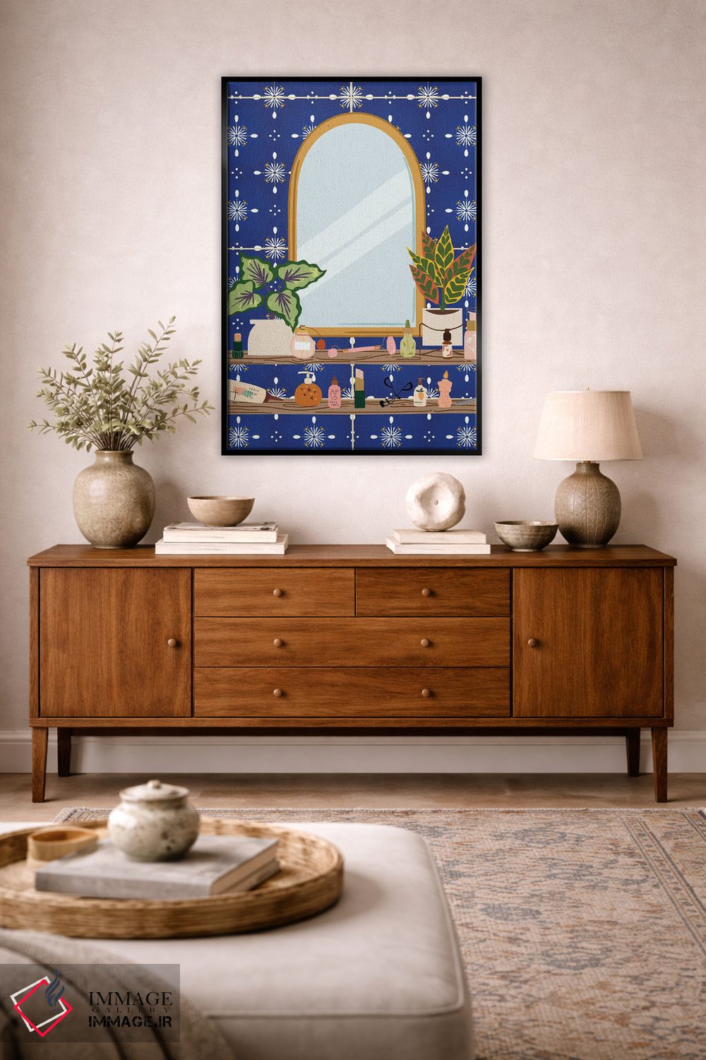 براساس پالت ترکیبی اثر، قاب تیک گرم (چوبی) پیشنهاد اول است و مشکی مات (فریم متوسط) مکمل. برای سفارشهای پروژهای با ابعاد و قابهای اختصاصی با ایماژ در تماس باشید.