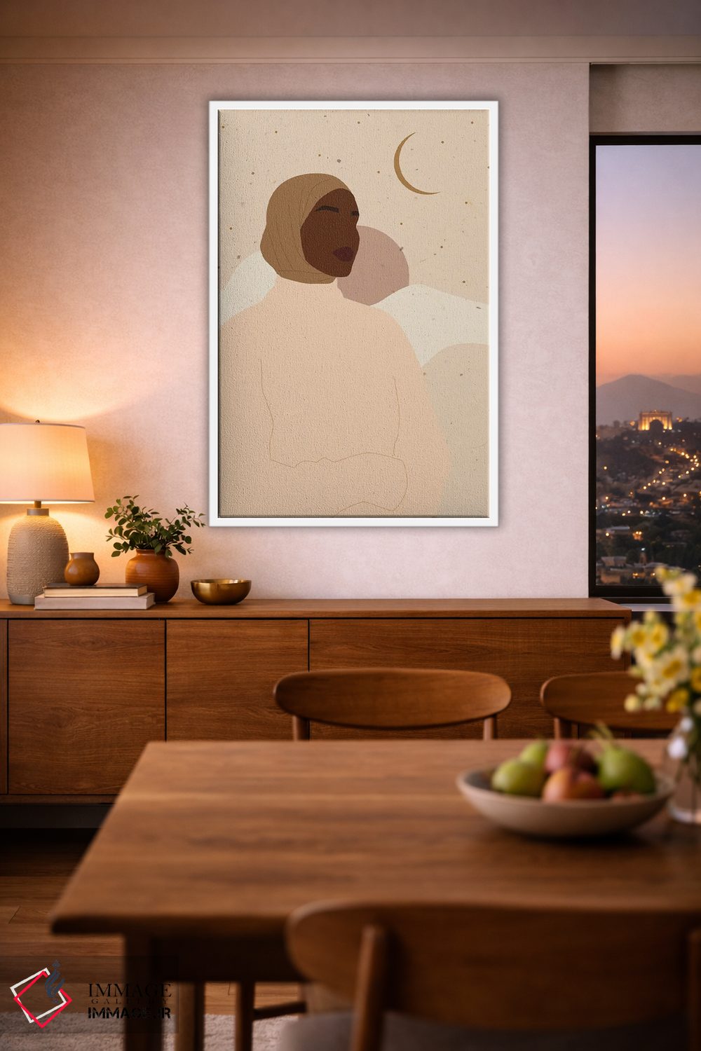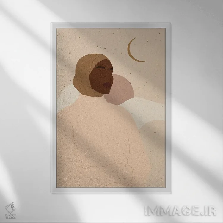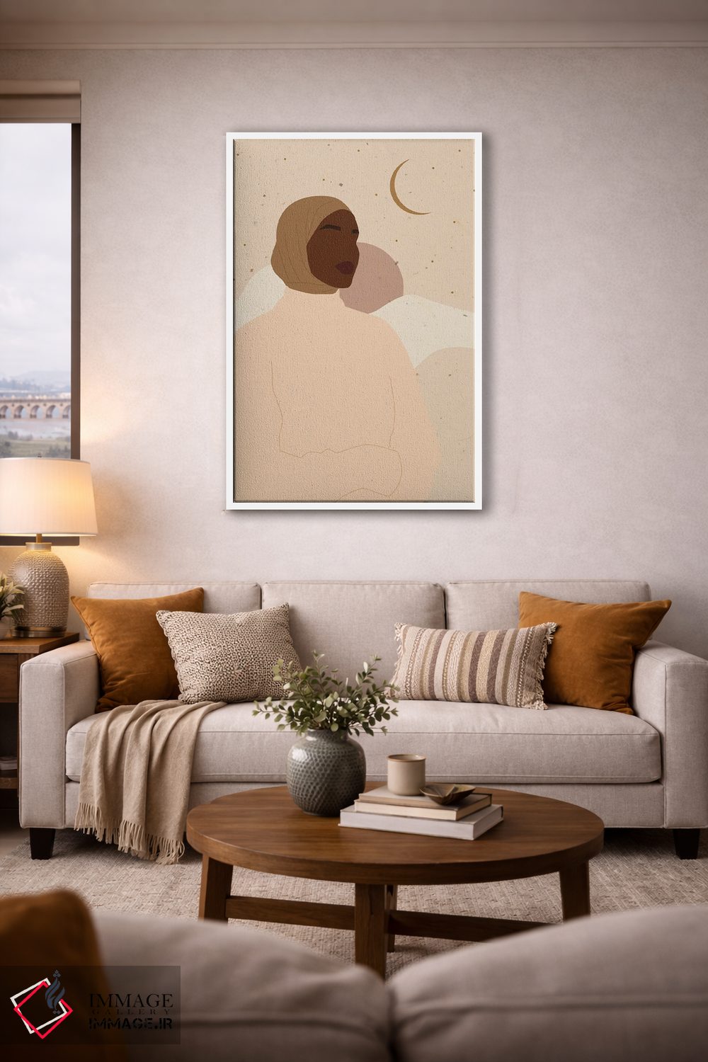 براساس پالت گرم اثر، قاب بلوط روشن (چوبی) پیشنهاد اول است و استخوانی ملایم مکمل. برای سفارشهای پروژهای با ابعاد و قابهای اختصاصی با ایماژ در تماس باشید.