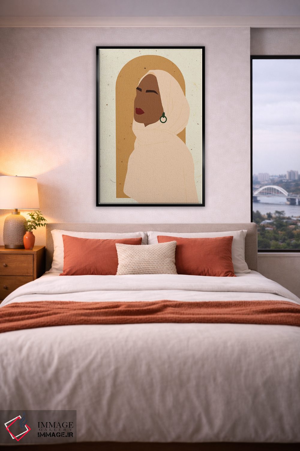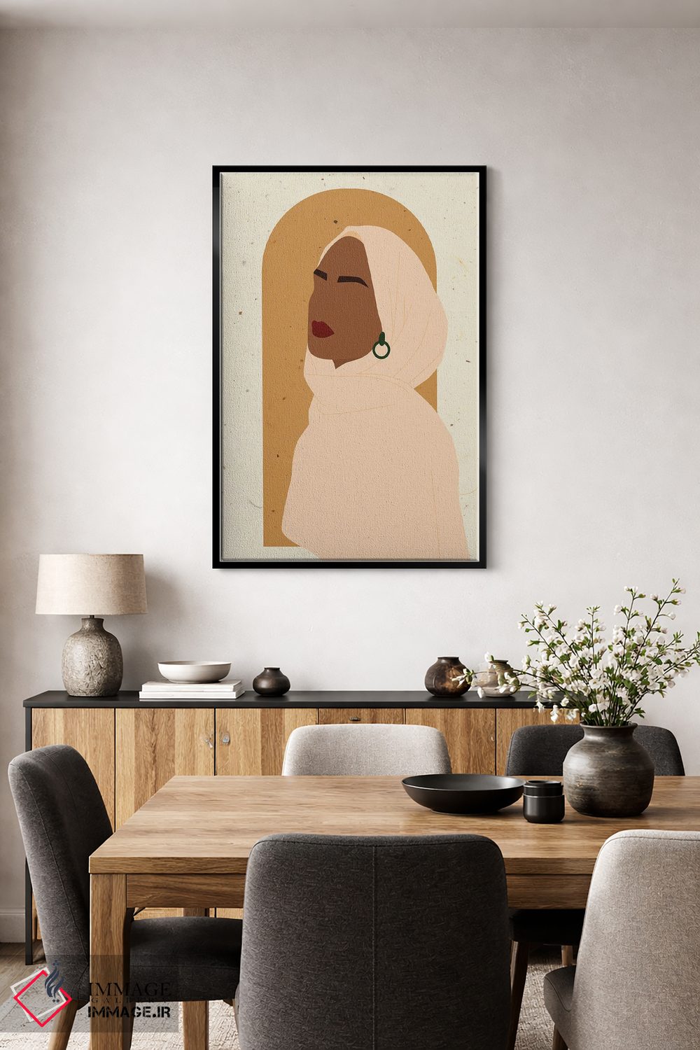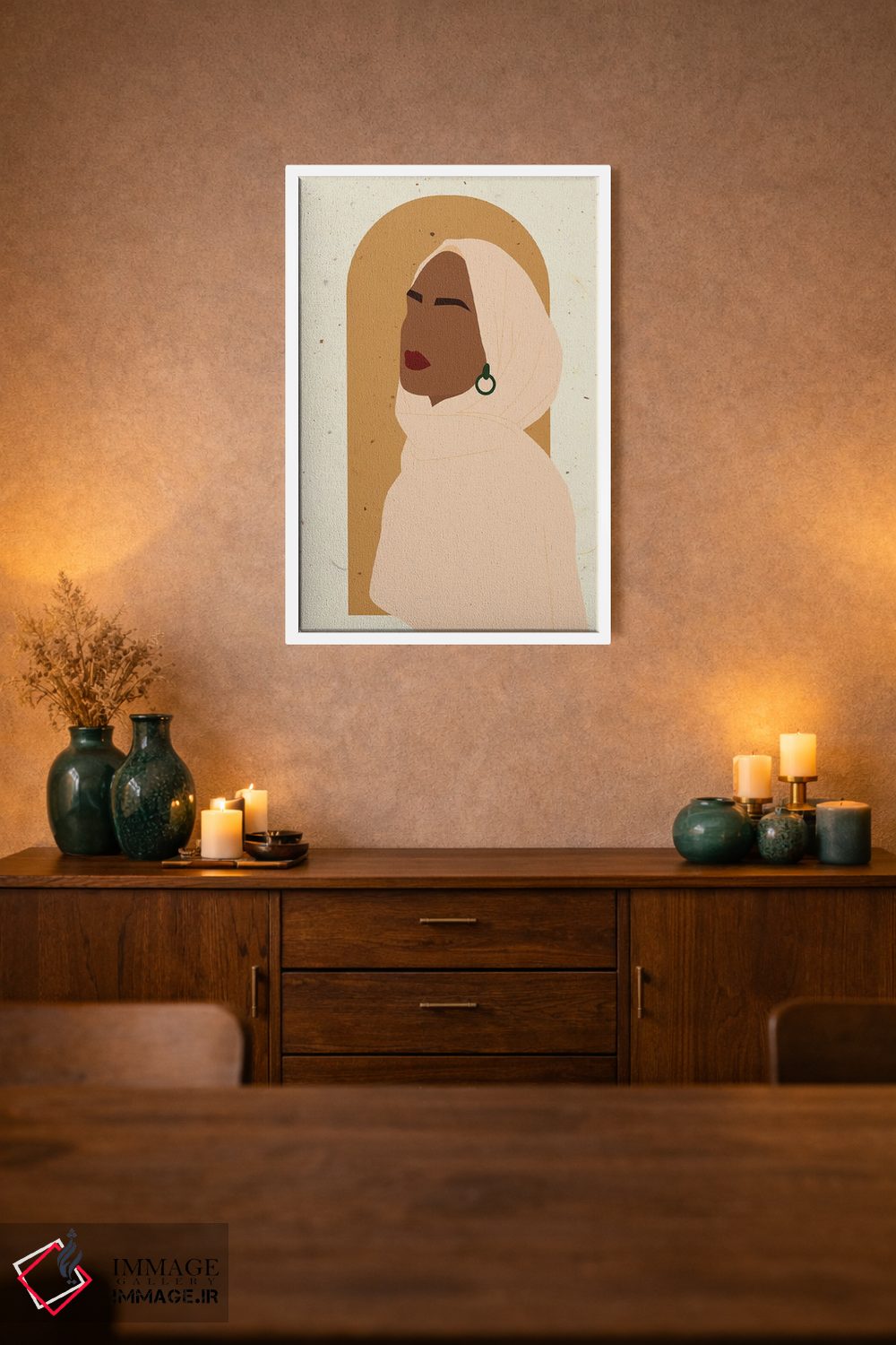 براساس پالت گرم اثر، قاب بلوط روشن (چوبی) پیشنهاد اول است و استخوانی ملایم مکمل. برای سفارشهای پروژهای با ابعاد و قابهای اختصاصی با ایماژ در تماس باشید.