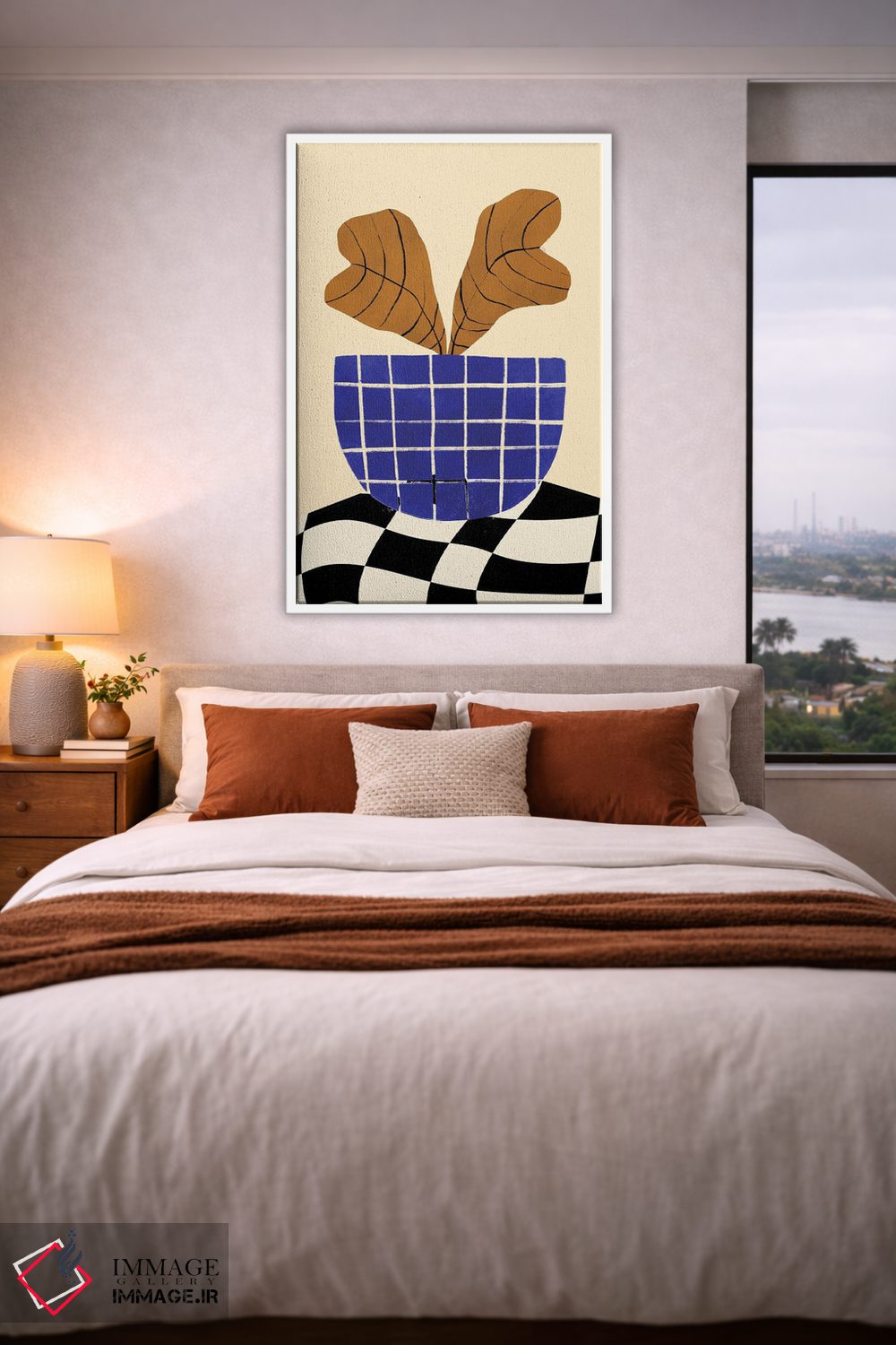 براساس پالت ترکیبی اثر، قاب بلوط روشن (چوبی) پیشنهاد اول است و استخوانی ملایم مکمل. برای سفارشهای پروژهای با ابعاد و قابهای اختصاصی با ایماژ در تماس باشید.
