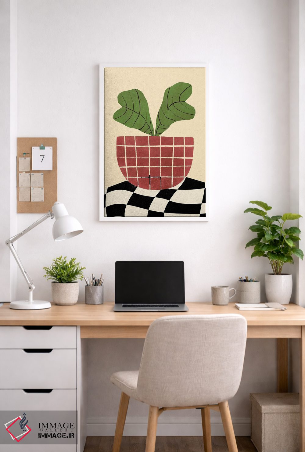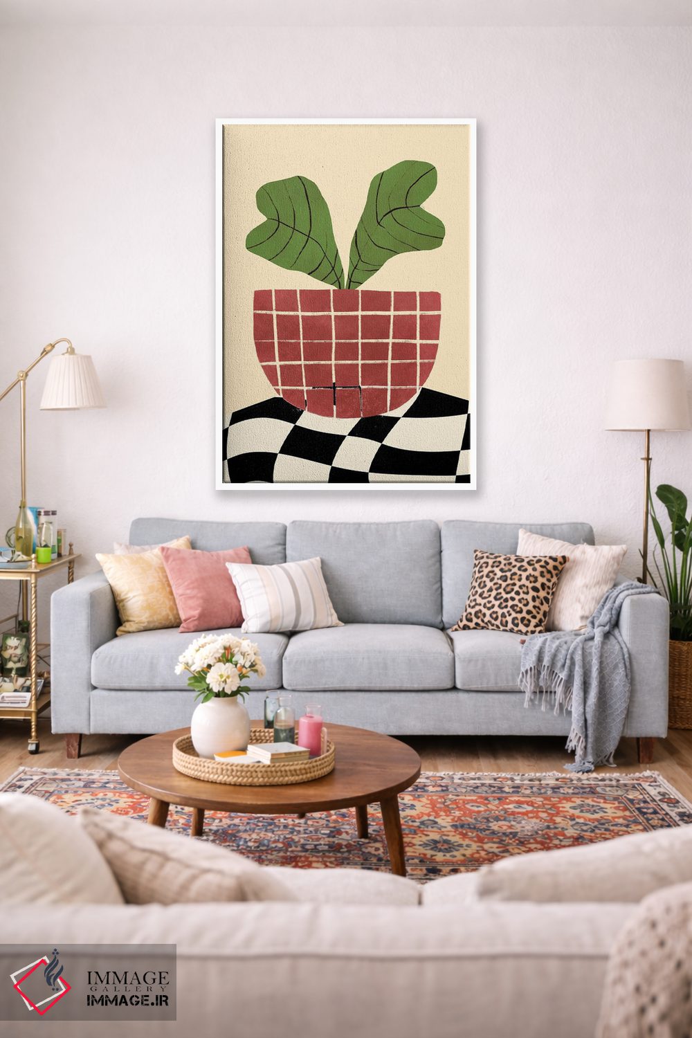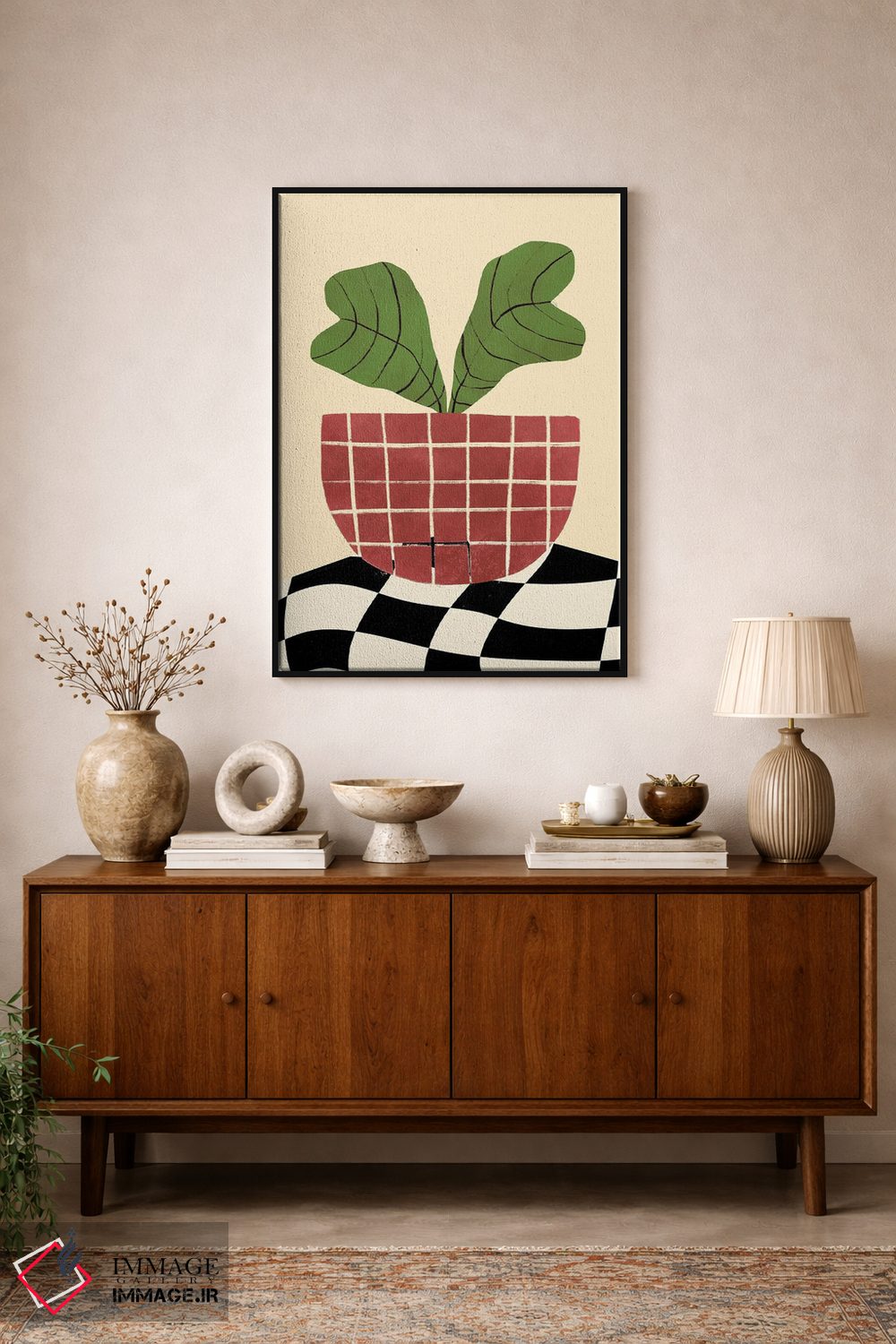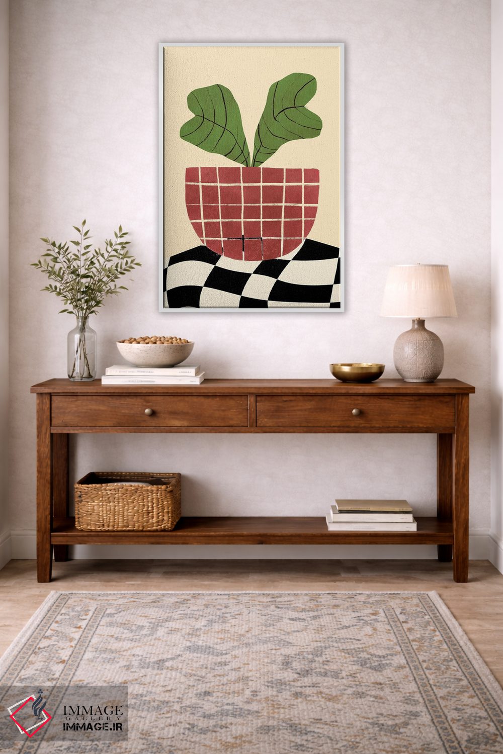 اگر دوست دارید هماهنگی کاملتر شود، رنگِ قرمز را در یک گلدان مینیمال دوباره بیاورید تا نگاه به سمت اثر هدایت شود. اغراق لازم نیست.