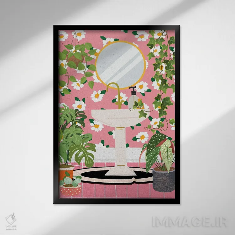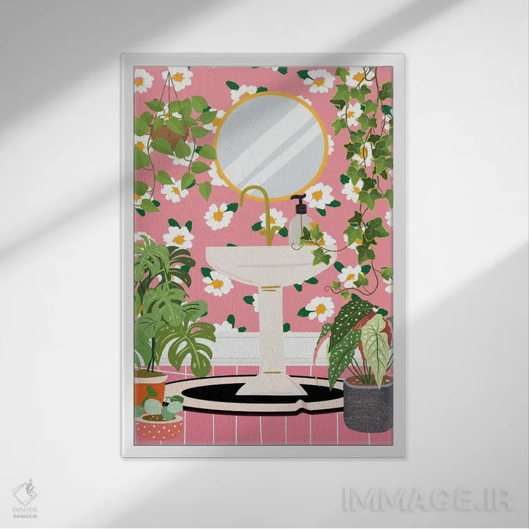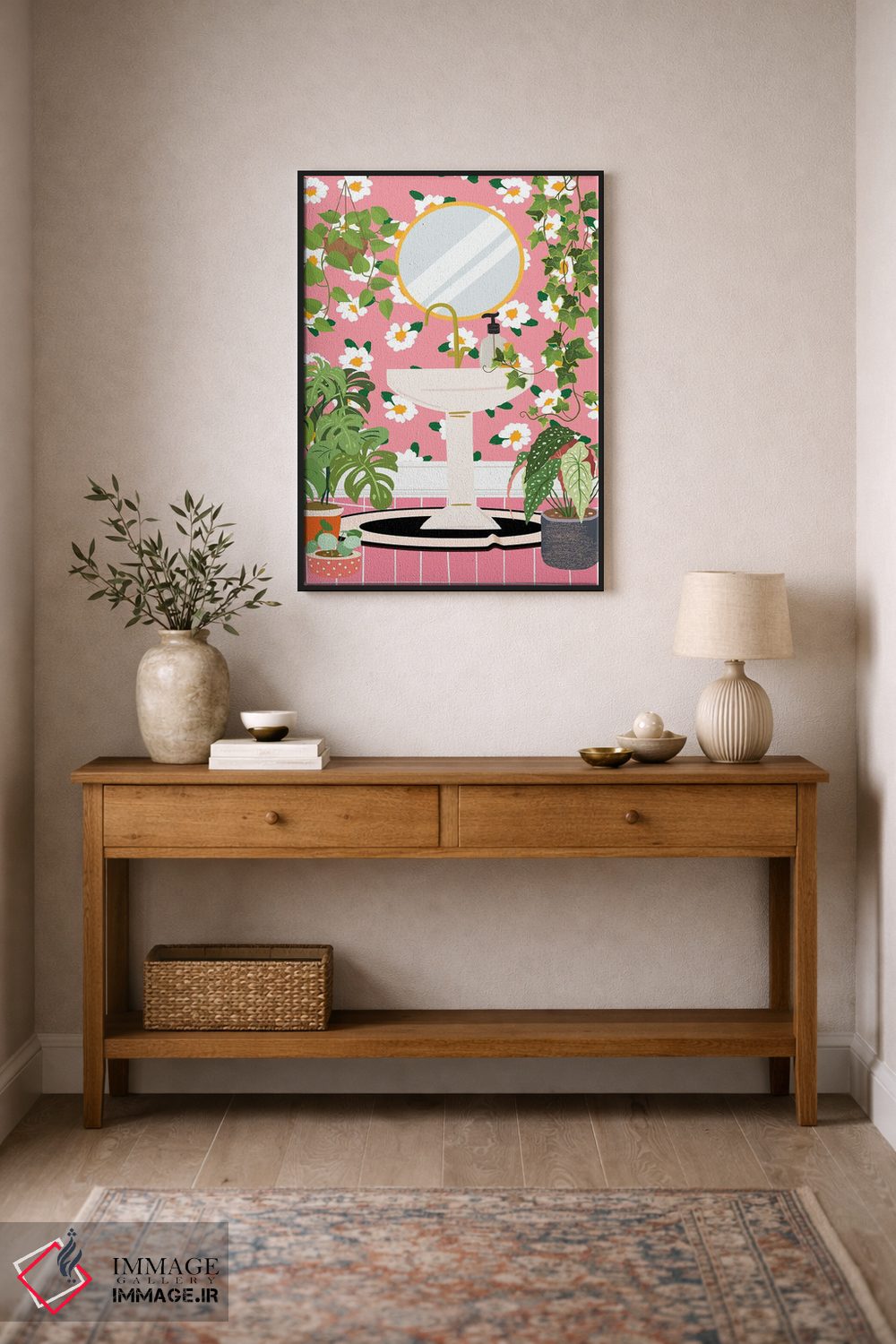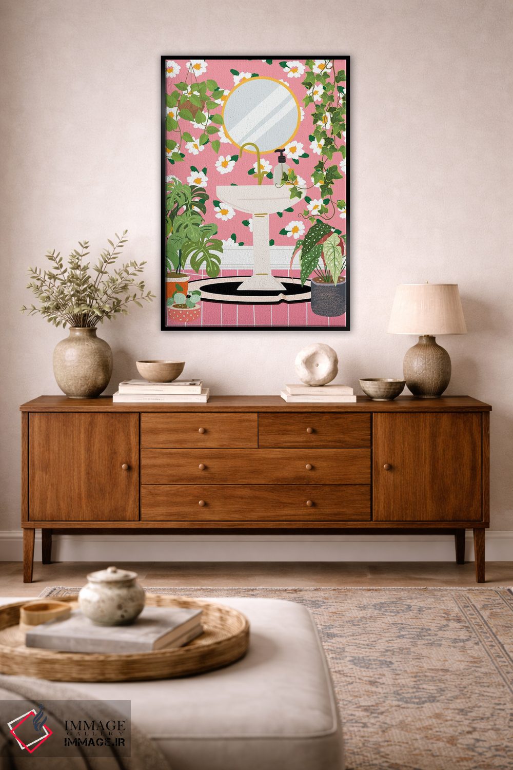 اگر دوست دارید دیوار روشنتر و آرامتر دیده شود، «روشویی در حمام جنگلی بوهو (بوهمیایی)» اثرِ «ژانیا شاریپژانوا» چیدمان را از خشکی بیرون میآورد، برای نشیمنهای روشن گزینهٔ مناسبیست. جزئیاتش از نزدیک هم ارزش تماشا دارد.