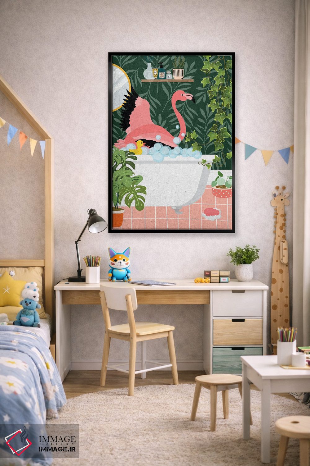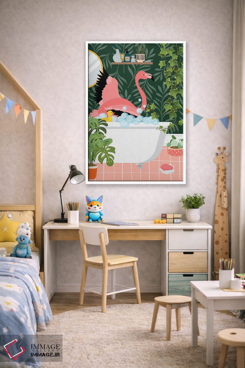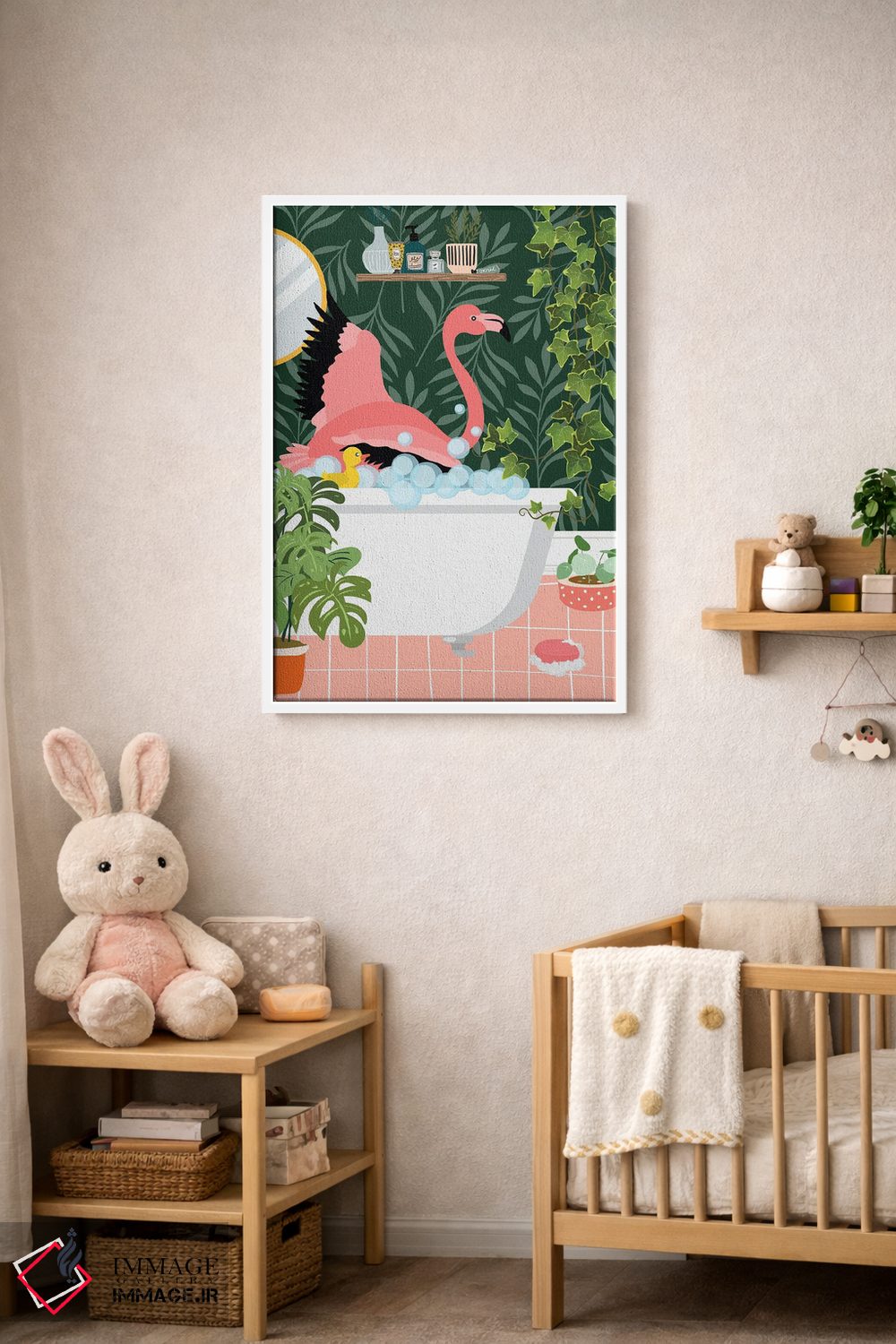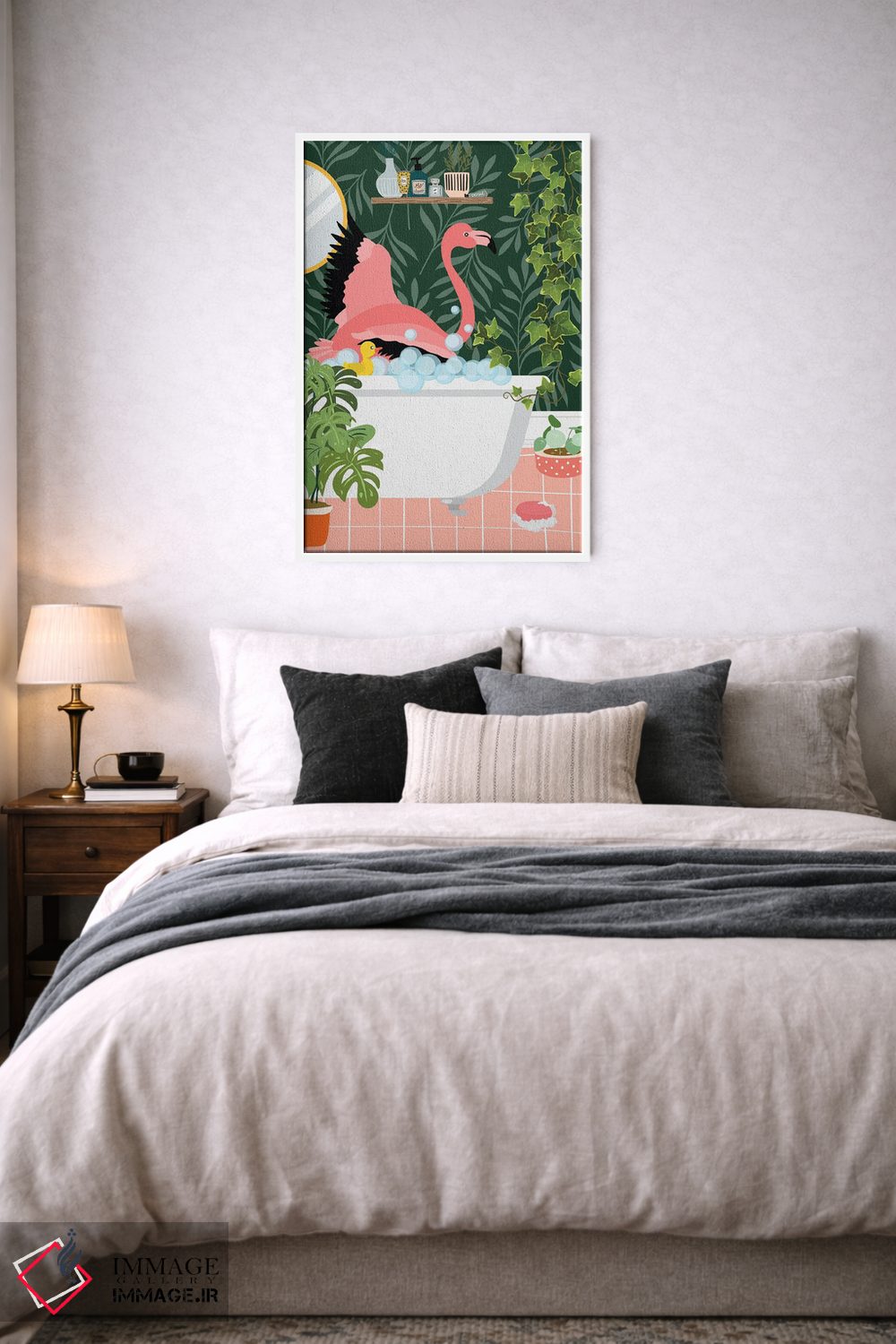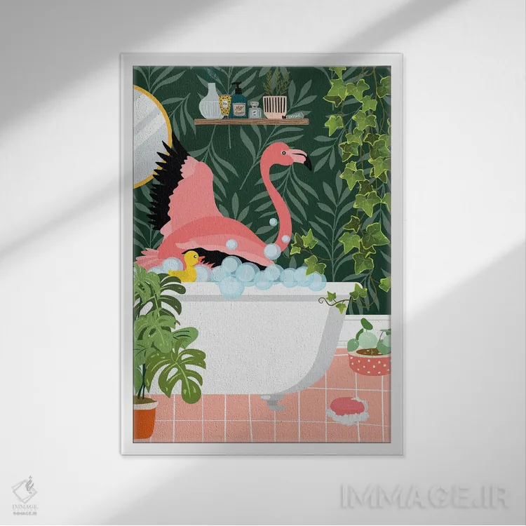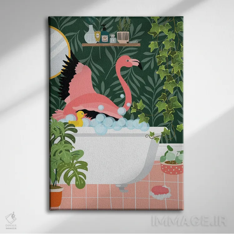 تابلو دکوراتیو فلامینگو در حال حمام گرفتن در حمام گیاهی اثر ژانیا شاریپژانوا