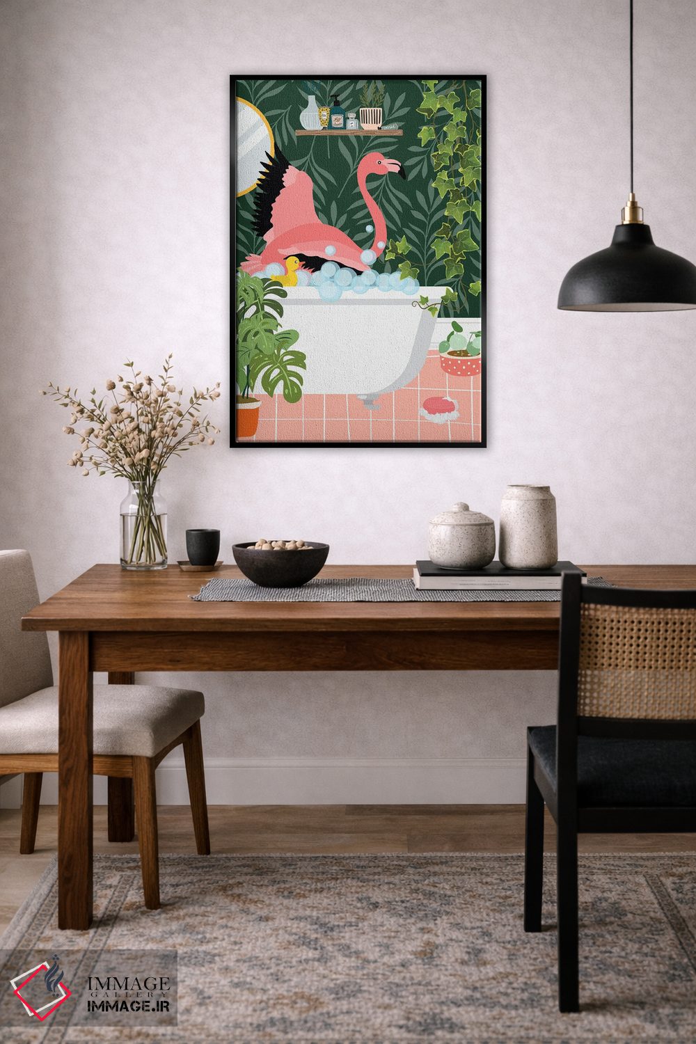 «فلامینگو در حال حمام گرفتن در حمام گیاهی» اثرِ «ژانیا شاریپژانوا» از آن کارهاییست که برای دکورهای مینیمال، یک نقطهٔ توجه میسازد؛ برای کافههای کوچک و صمیمی انتخاب خوبیست. هم فضا را گرم میکند، هم شلوغش نمیکند.