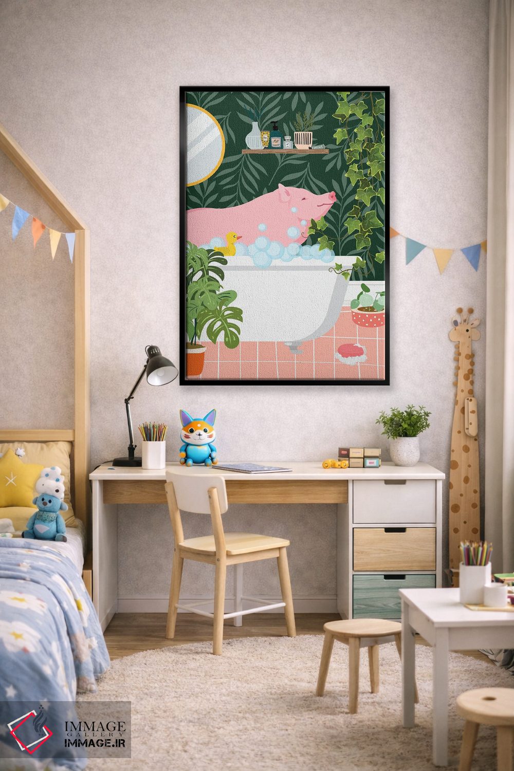 برای دیوارهای ساده، «خوک در حال حمام گرفتن در حمام گیاهی» اثرِ «ژانیا شاریپژانوا» بدون کودکانه شدن، بازیگوش و خوشپرداخت میماند؛ برای خانههایی با چوب و پارچههای گرم انتخابی خوشسلیقه است. با نورپردازی نقطهای، جذابتر هم میشود.