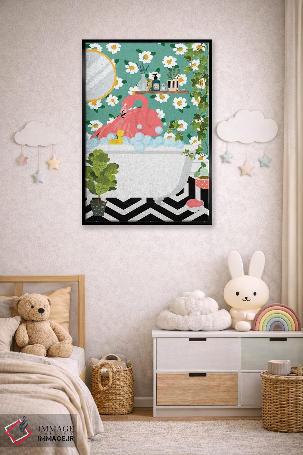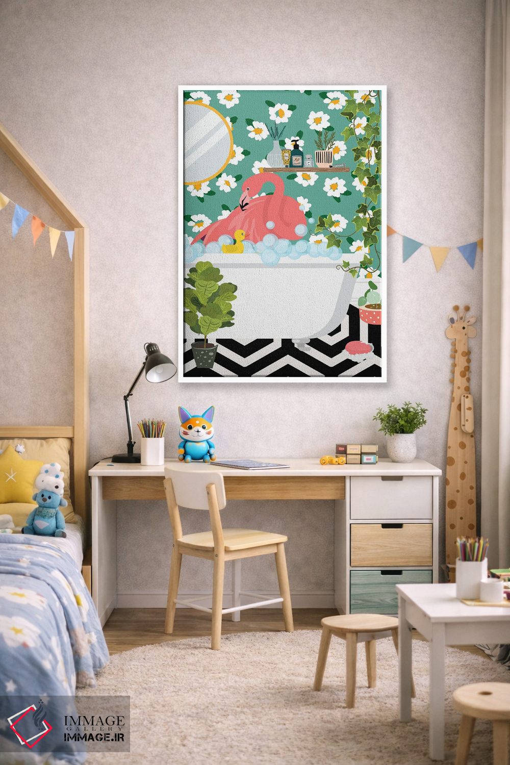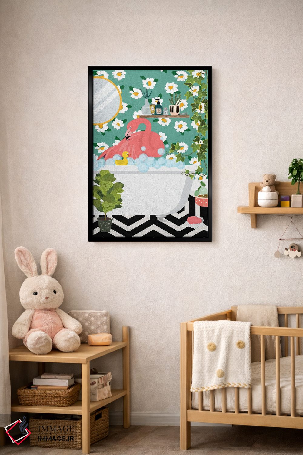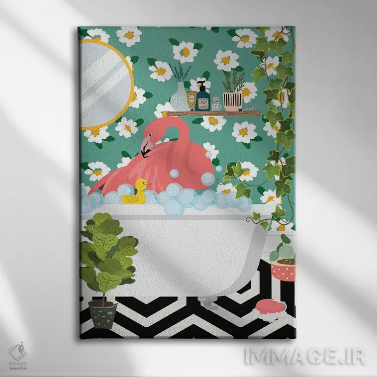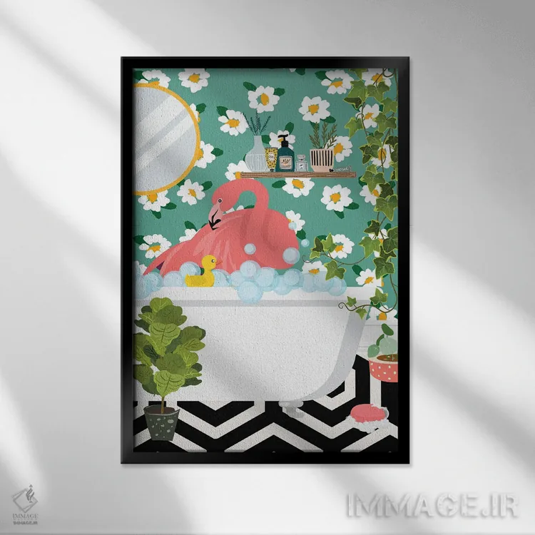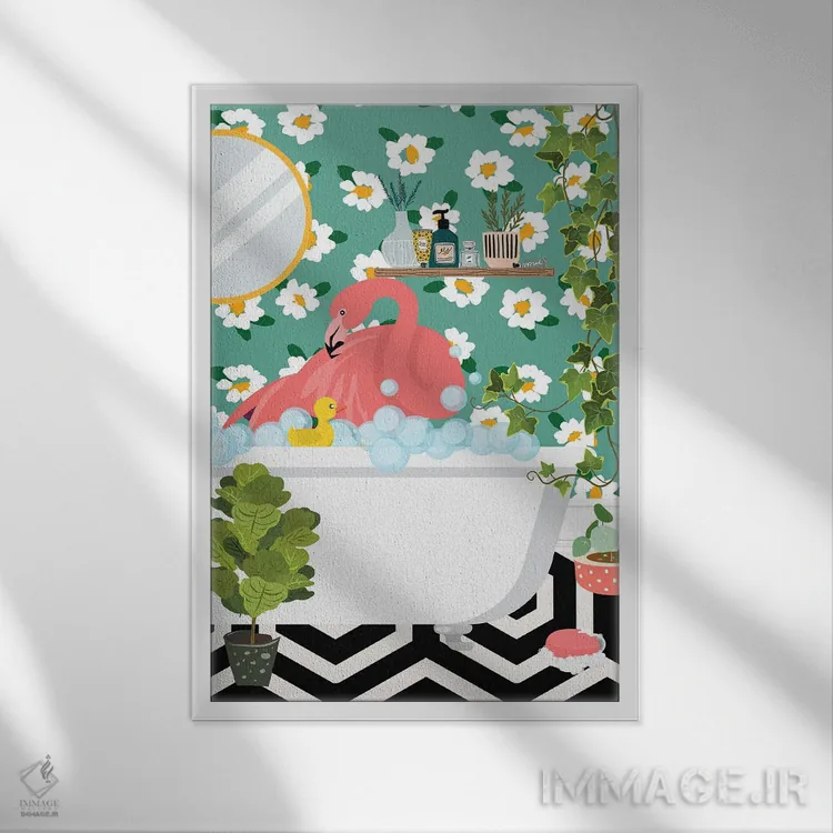 در «فلامینگو در حال حمام گرفتن در حمام جنگلی من» اثرِ «ژانیا شاریپژانوا»، حضور حیوانات به دیوار، انرژیِ نرم و زنده میدهد؛ برای خانههایی با چوب و پارچههای گرم انتخابی خوشسلیقه است. در کنار گیاهان و نور طبیعی، جذابتر هم میشود.