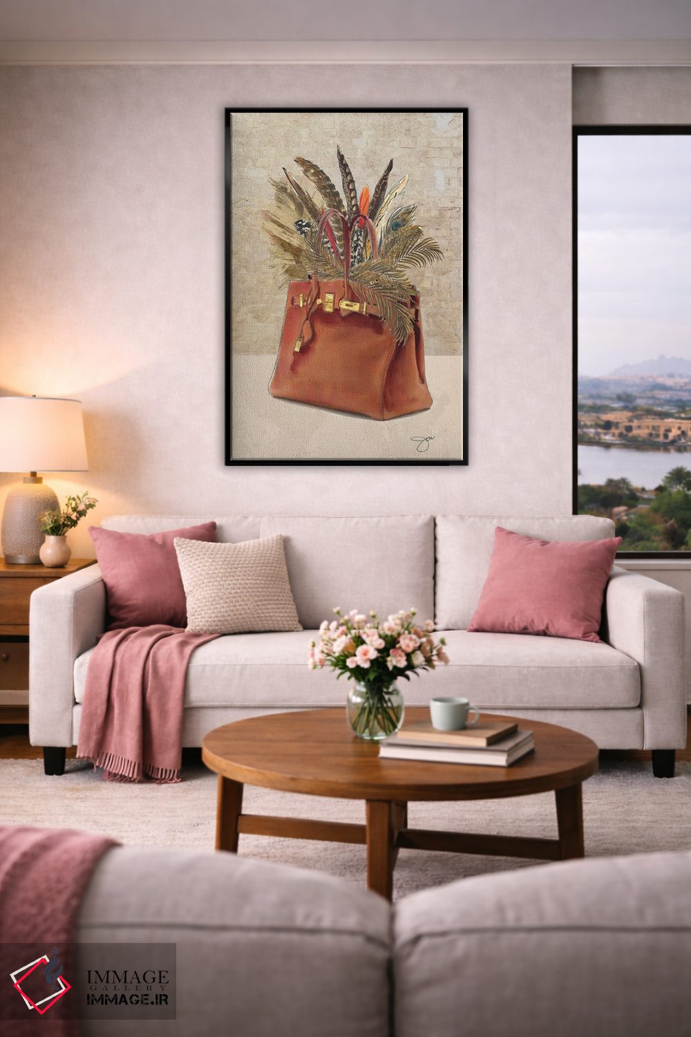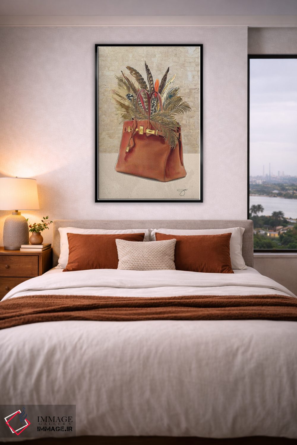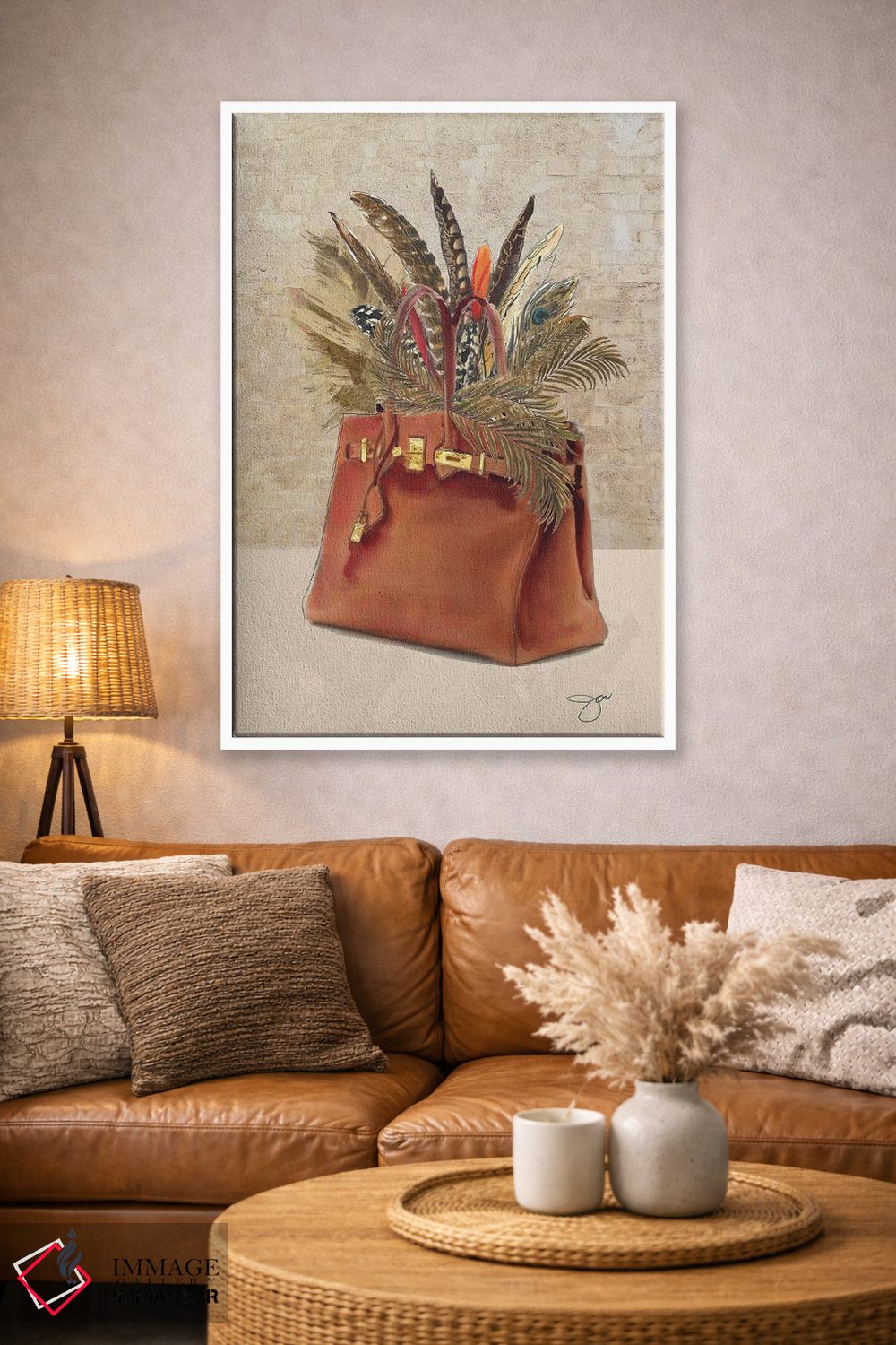 براساس پالت گرم اثر، قاب بلوط روشن (چوبی) پیشنهاد اول است و استخوانی ملایم مکمل. برای سفارشهای پروژهای با ابعاد و قابهای اختصاصی با ایماژ در تماس باشید.