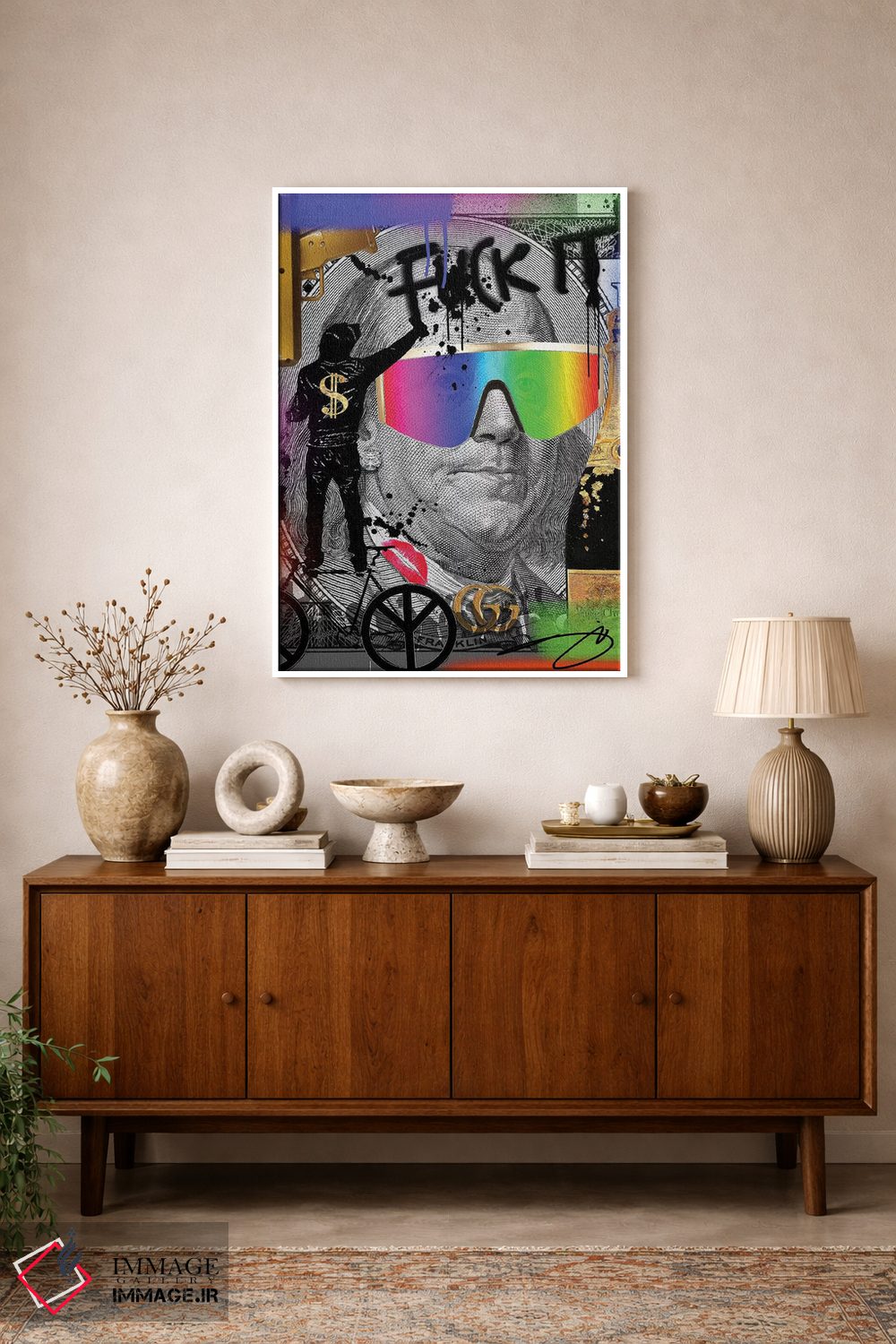 براساس پالت ترکیبی اثر، قاب تیک گرم (چوبی) پیشنهاد اول است و مشکی مات (فریم متوسط) مکمل. برای سفارشهای پروژهای با ابعاد و قابهای اختصاصی با ایماژ در تماس باشید.