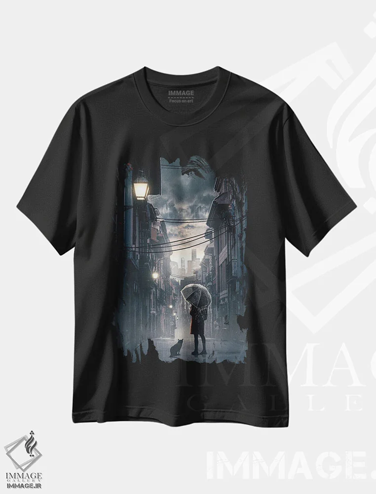 تی شرت «شبح بارانی»؛ گربه سیاه در هوای رویایی