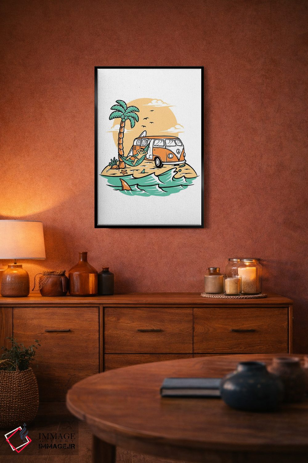 براساس پالت ترکیبی اثر، قاب تیک گرم (چوبی) پیشنهاد اول است و مشکی مات (فریم متوسط) مکمل.