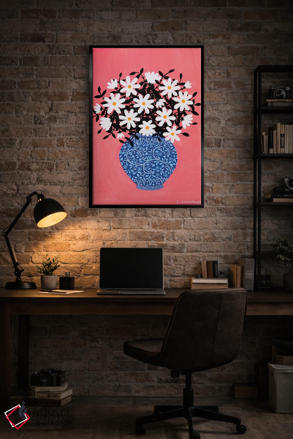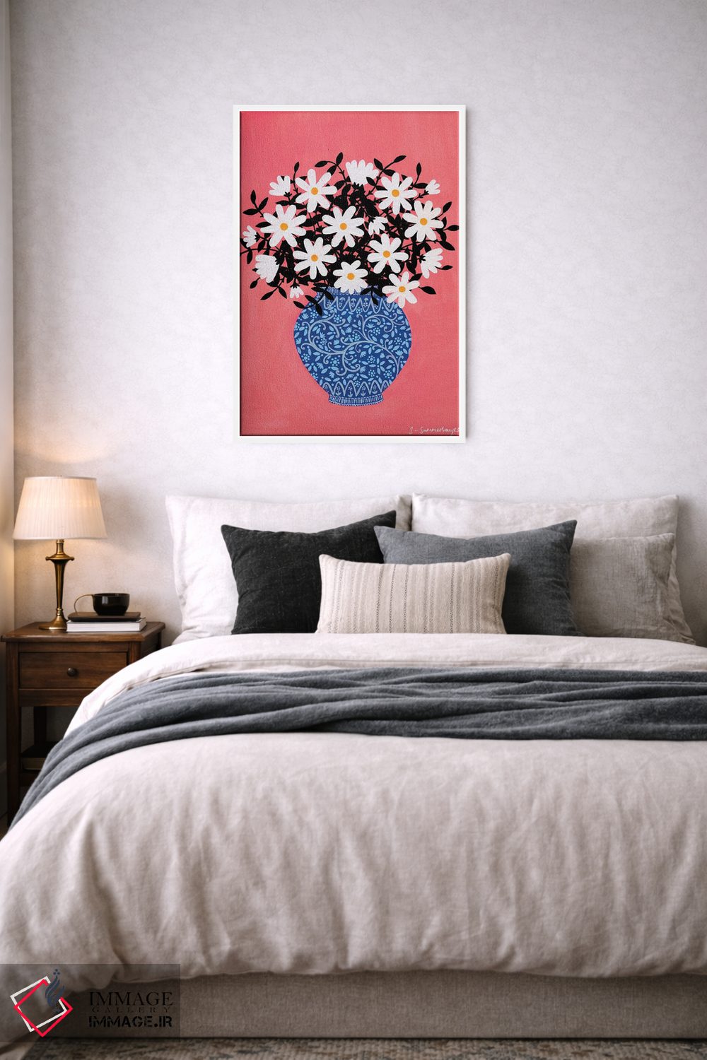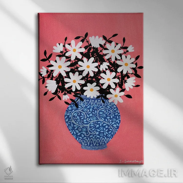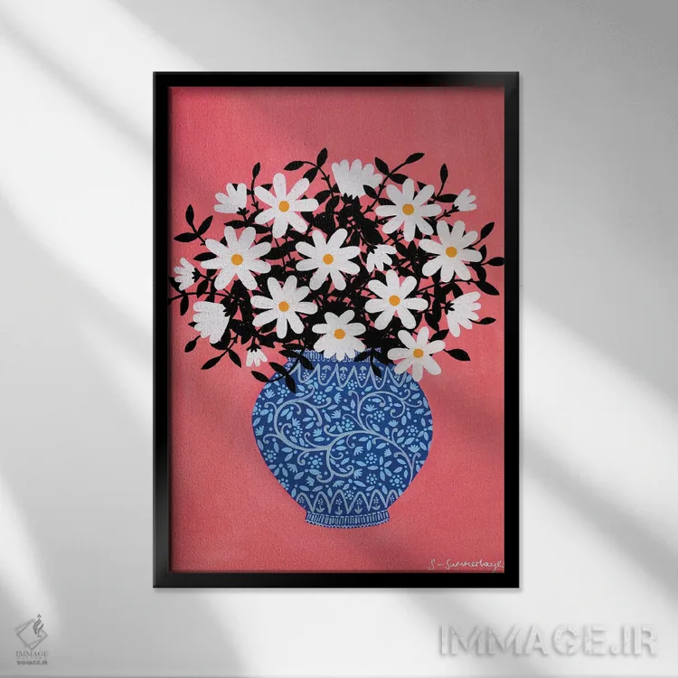 برای دیواری که میخواهید نرمتر دیده شود، «گل مینای چمنی» اثرِ «سیان سامرحیز» در کنار چوب و پارچههای روشن، عالی مینشیند؛ برای خانههایی با نور طبیعی انتخابی خوشسلیقه است. فضا را شلوغ نمیکند؛ فقط لطیفترش میکند.