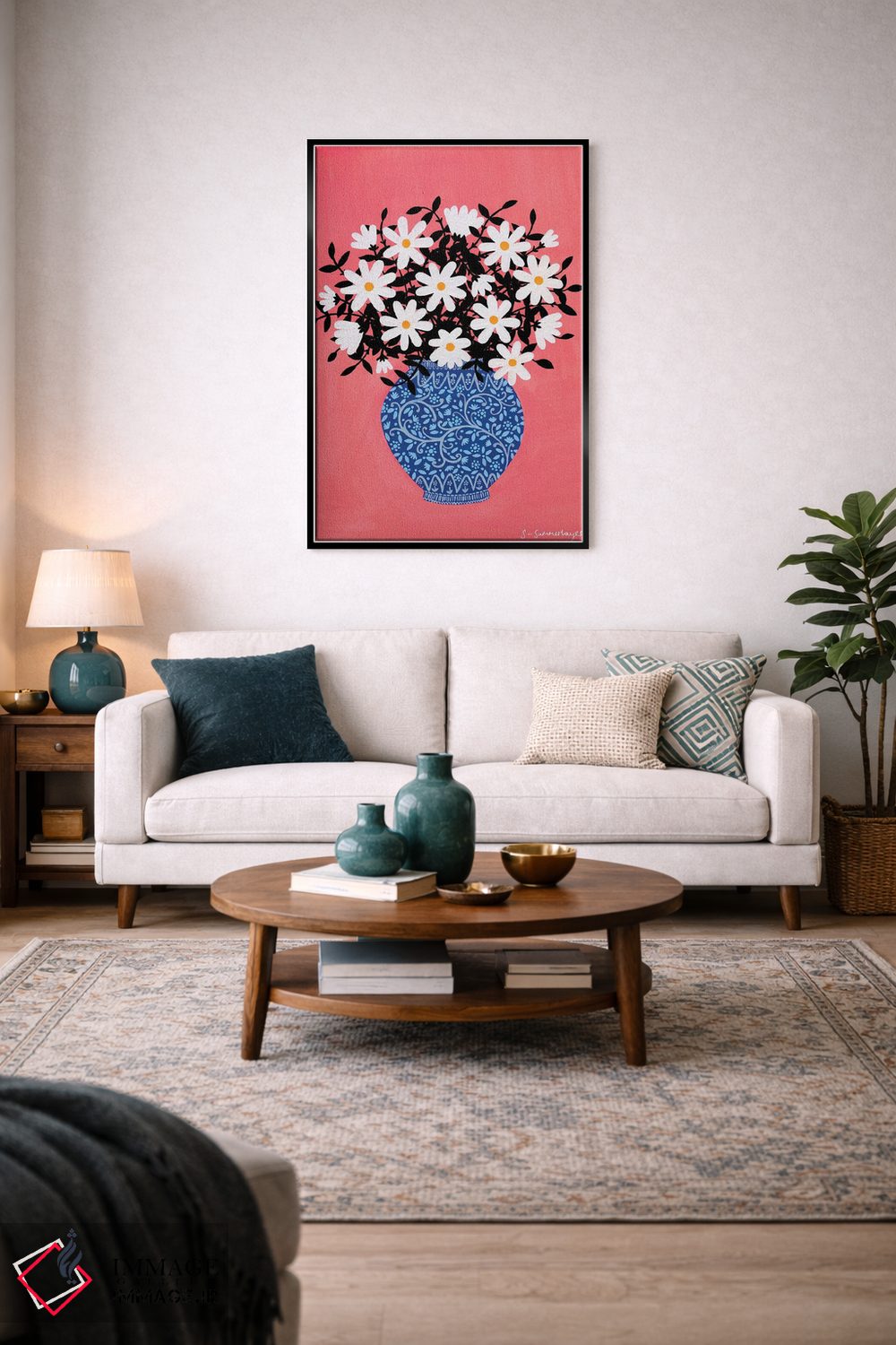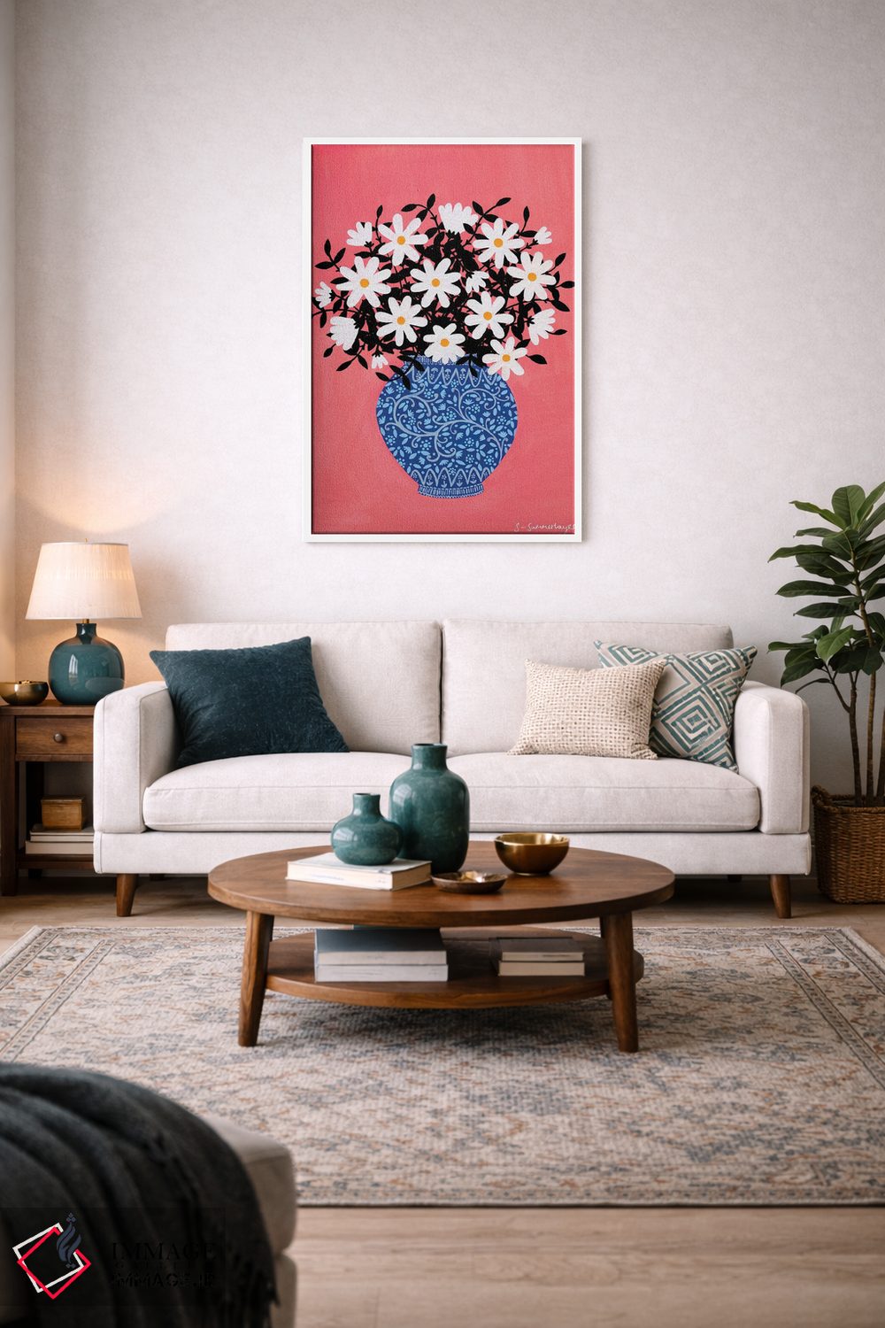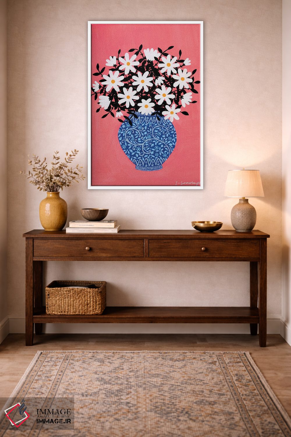 اگر دوست دارید هماهنگی کاملتر شود، رنگِ صورتی را در یک تابلو کوچک مکمل دوباره بیاورید تا نگاه به سمت اثر هدایت شود. اغراق لازم نیست.