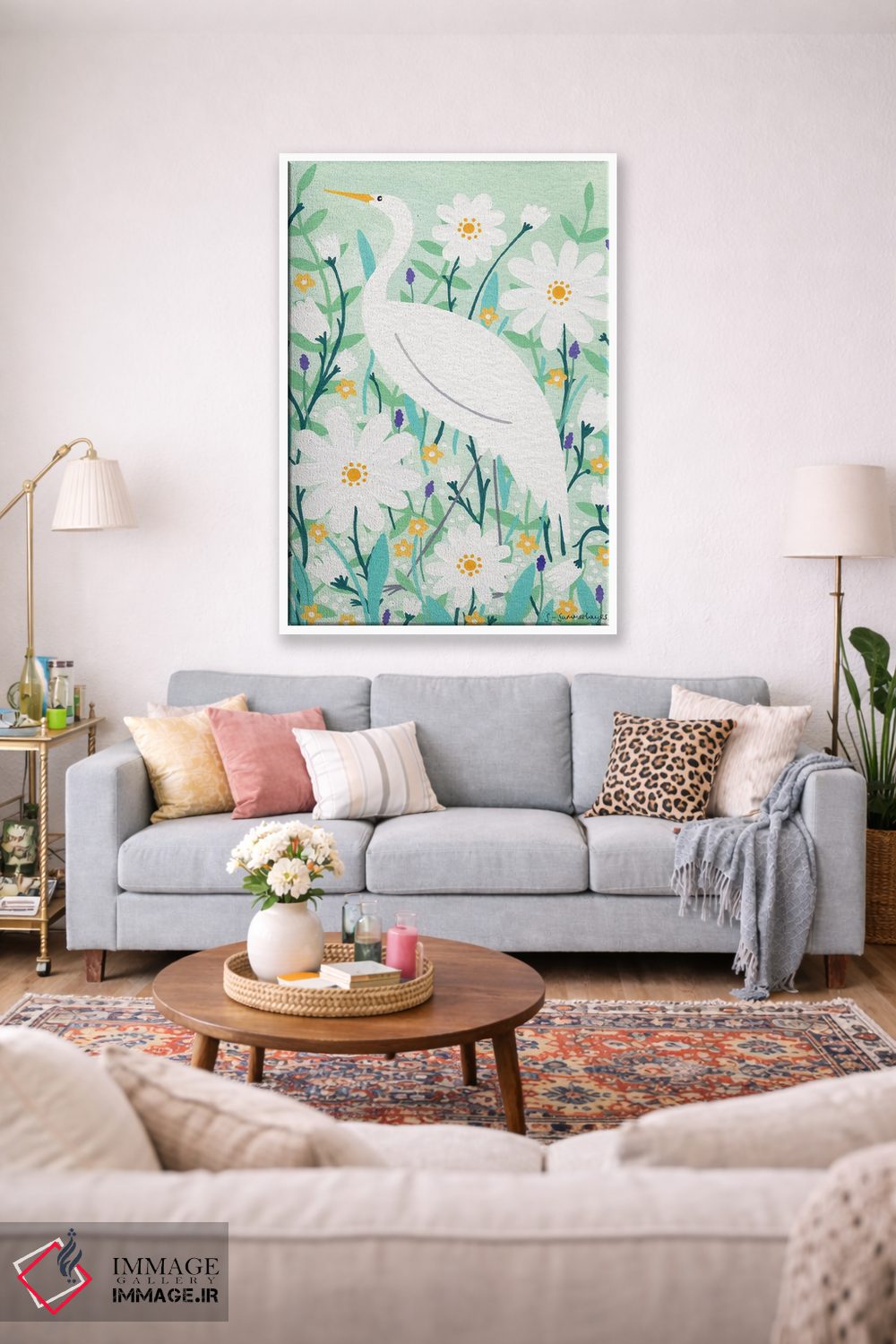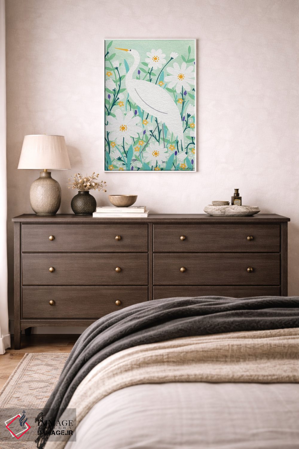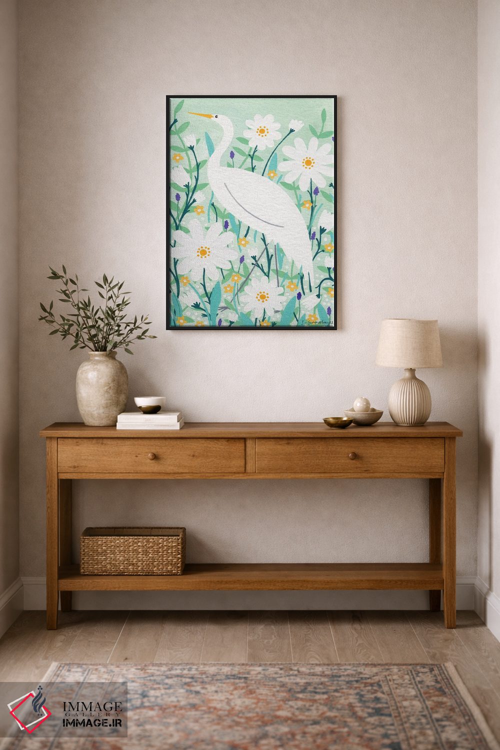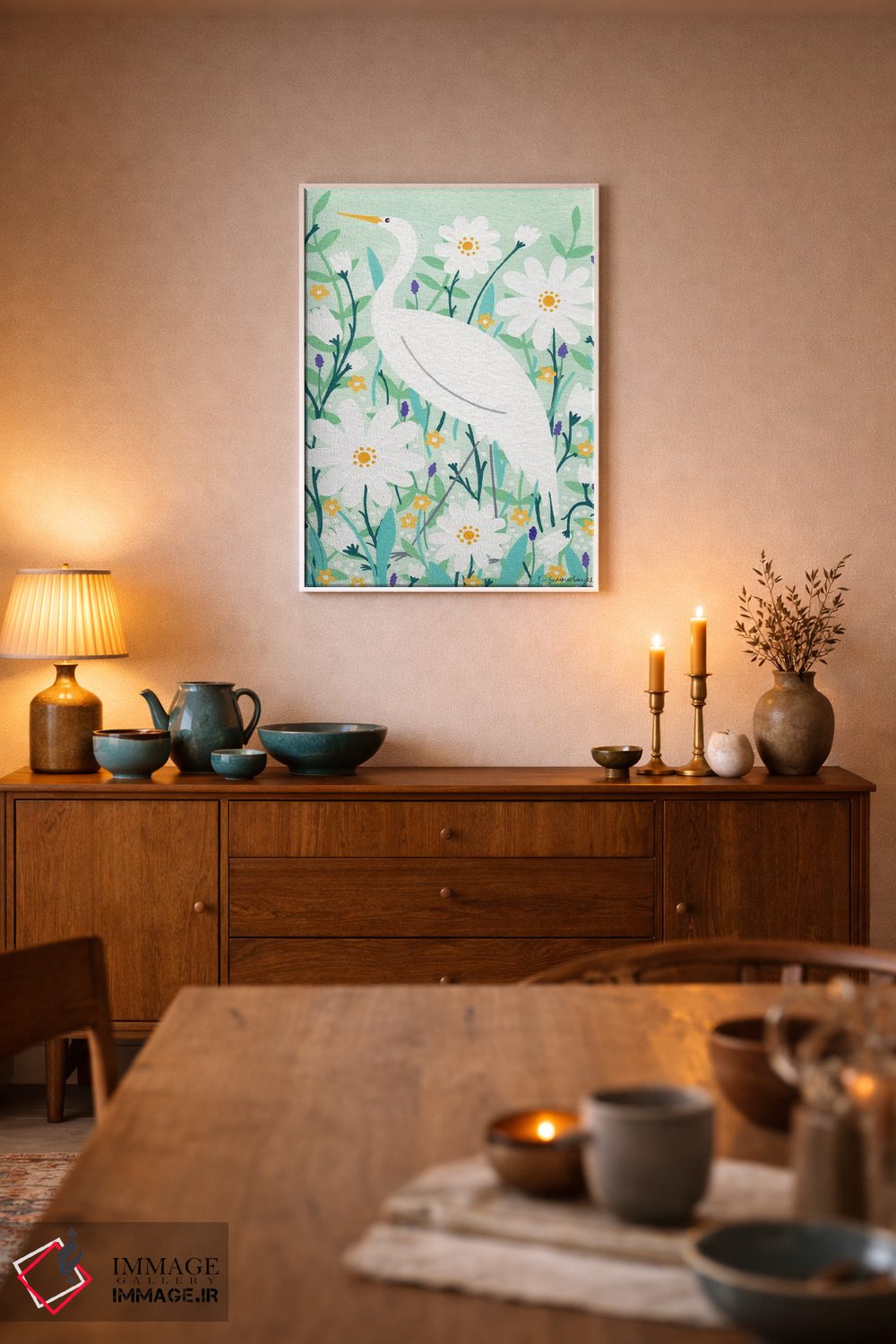 اگر میخواهید دیوار کمی سرزندگیِ محترمانه داشته باشد، «لکلک باشکوه» اثرِ «سیان سامرحیز» برای دکورهای مینیمال، یک نقطهٔ توجه میسازد، برای دکورهای مدرن و مینیمال گزینهٔ مناسبیست. برای دیوار گالریوار هم گزینهٔ خوبیست.