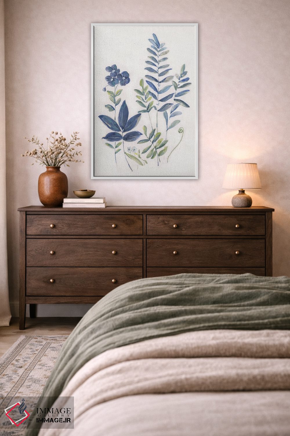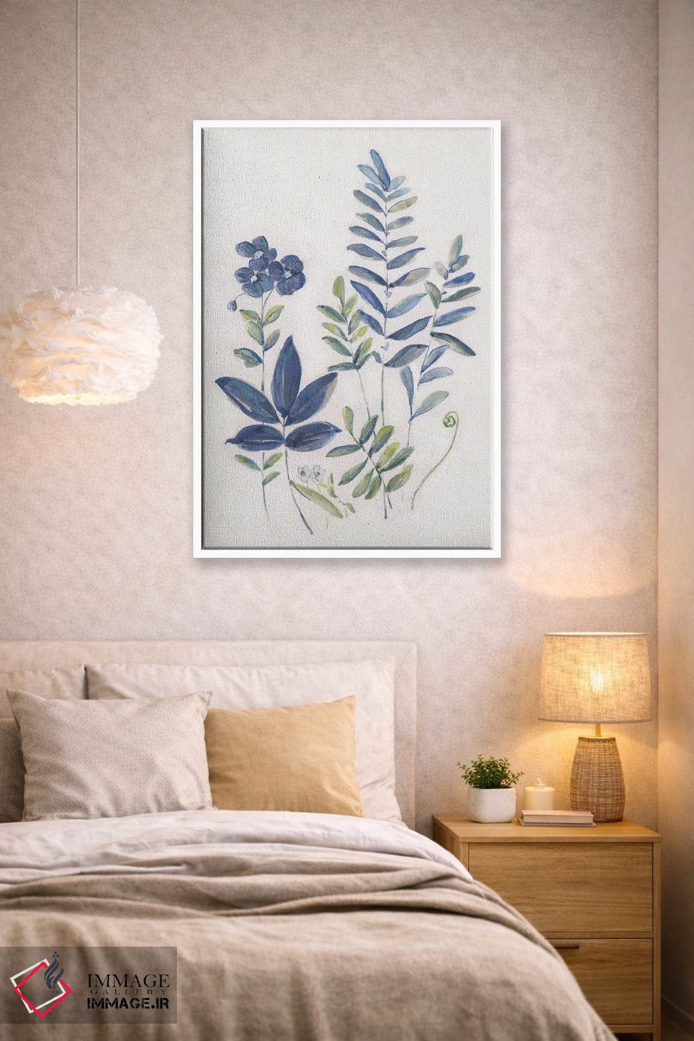 اگر دوست دارید دیوار روشنتر و آرامتر دیده شود، «مطالعه سرخس I» اثرِ «سالی سواتلند» فضا را نرمتر و مهماننوازتر میکند، برای اتاق خواب گزینهٔ مناسبیست. جزئیاتش از نزدیک هم ارزش تماشا دارد.