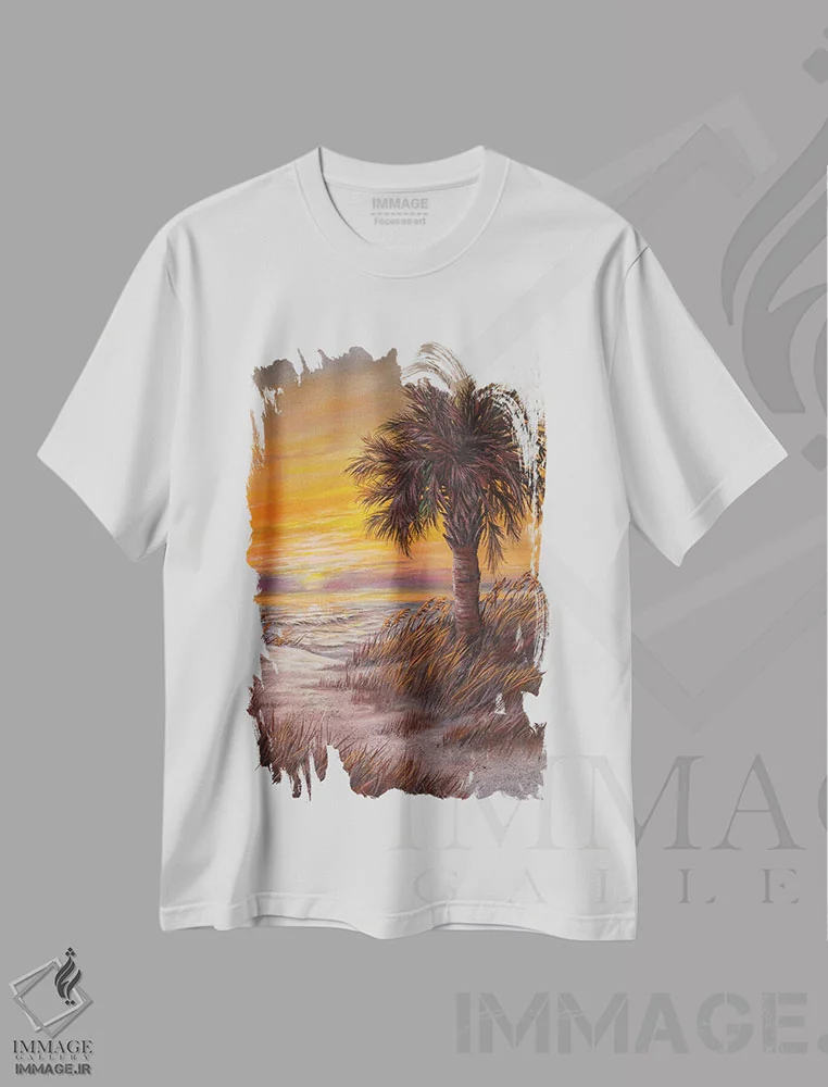 تیشرت سفید طرح دار طلوع نخل سان ها، دکور ساحلی اثر کمبل فراست | فروشگاه ایماژ