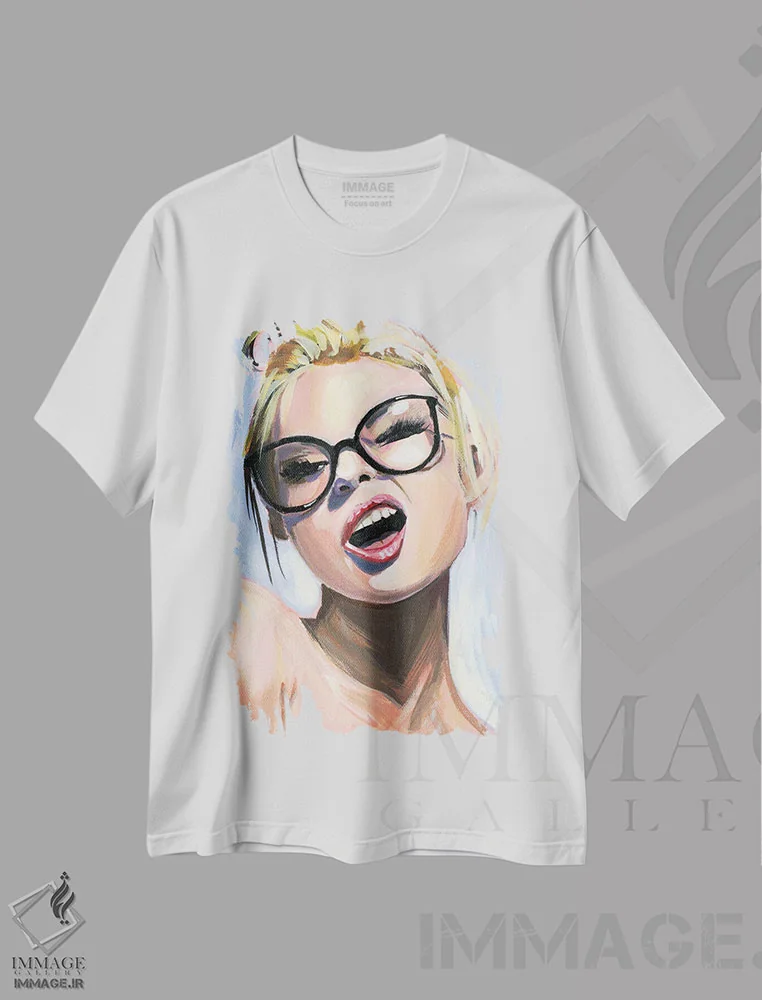 تیشرت سفید طرح دار دختر شوخ و شاداب، هنر فاخر معاصر اثر کتی مینگوس | فروشگاه ایماژ