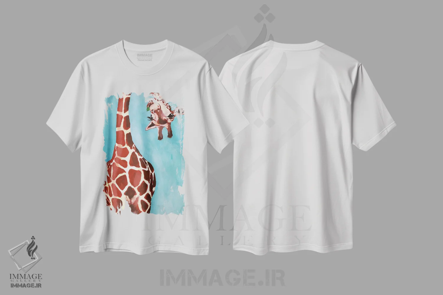 تیشرت سفید طرح دار زرافه ها با برگ سبز، دکور معاصر اثر کوکو د پاریس | فروشگاه ایماژ