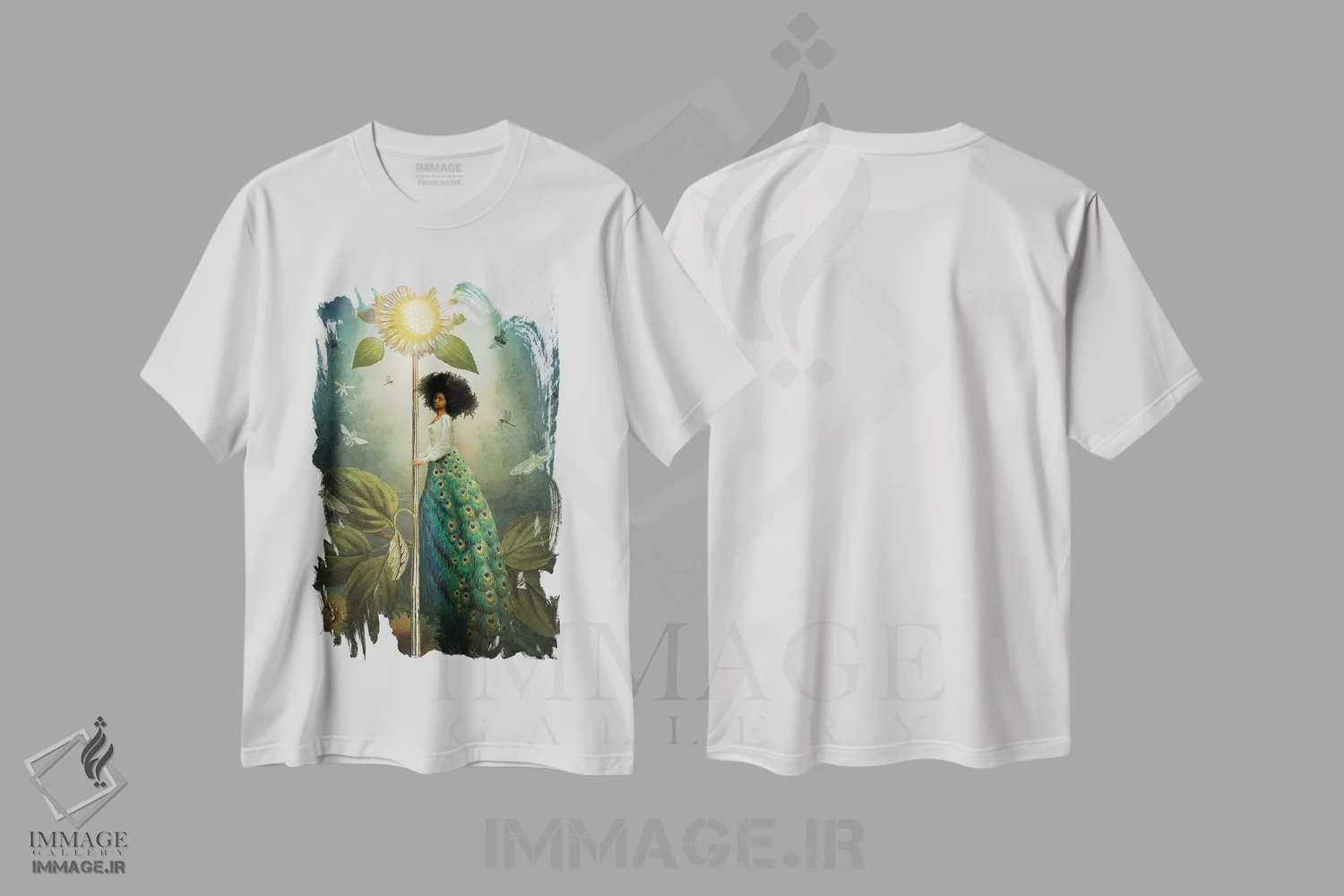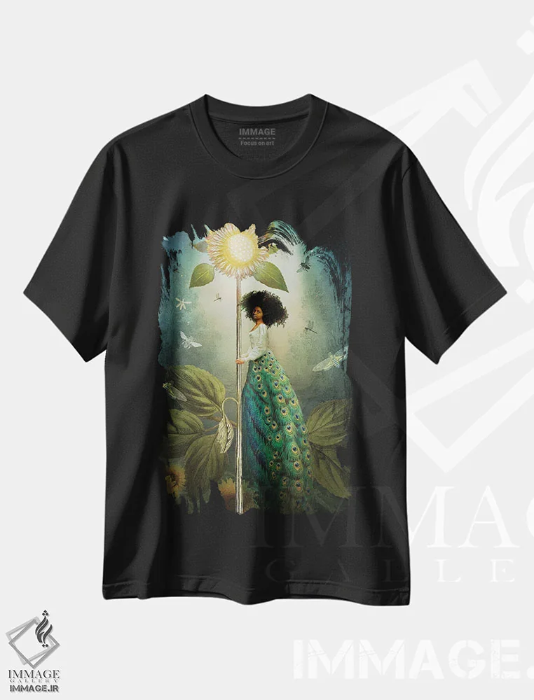 تی شرت «ملکه عصاها»؛ جلوه ای باشکوه از طاووس و گل آفتابگردان