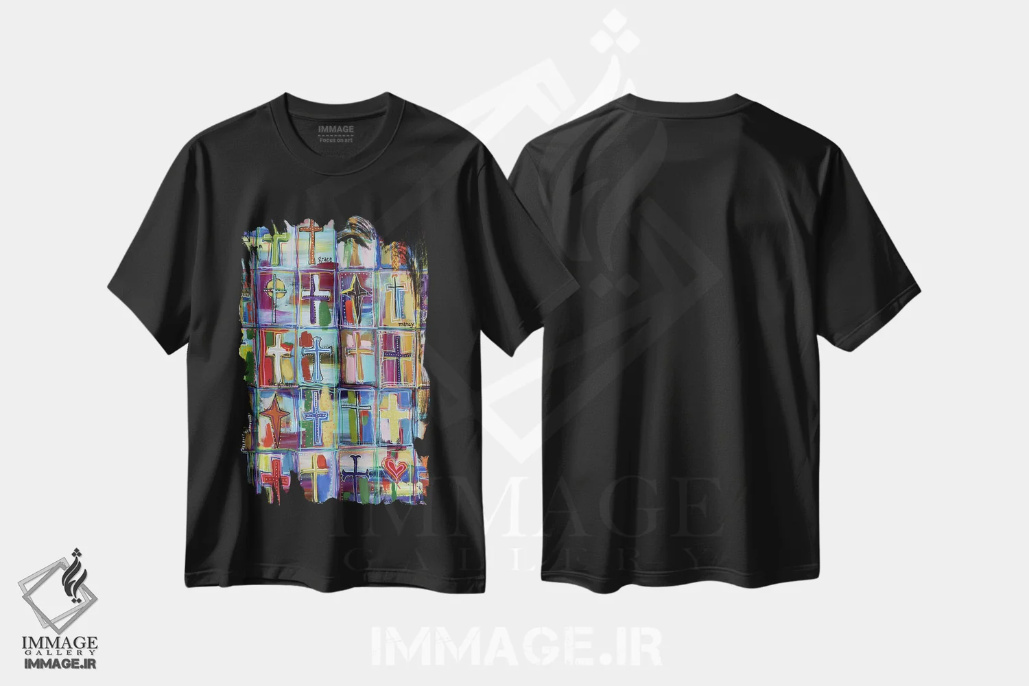 تیشرت مشکی طرح دار کلاژ صلیب مقدس، هنر دیجیتال اثر دیویدای هینْدز | فروشگاه ایماژ
