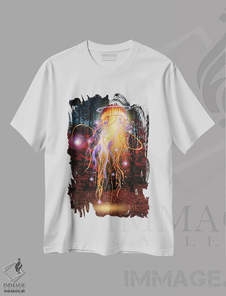 تیشرت سفید طرح دار عروس دریایی جنگلی در شب، هنر دیجیتال اثر دیوید لوبلاو | فروشگاه ایماژ
