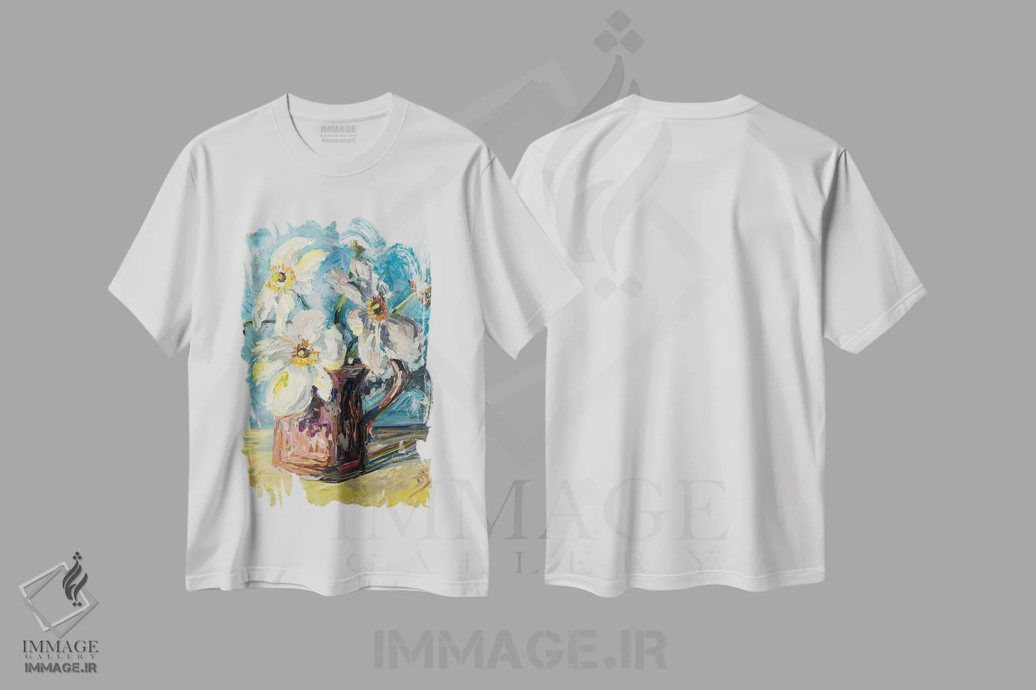 تی شرت هنری «متعادل شده با زمان»؛ ترکیب آرامش و شکوفه های معاصر