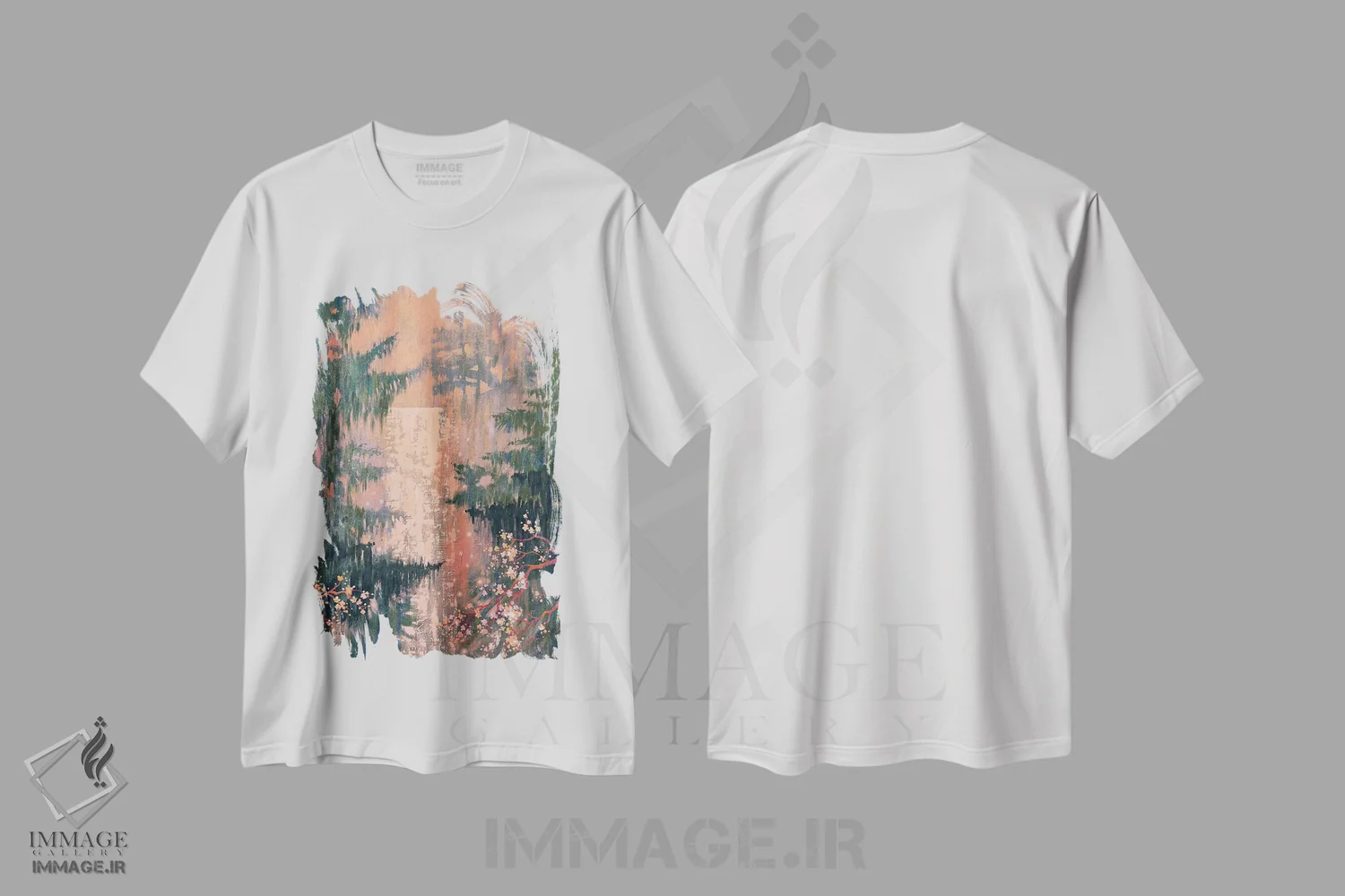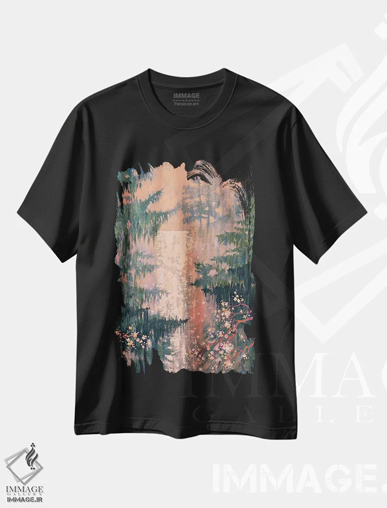 تیشرت طرح دار آبشار میان درختان مخروطی و ساکورا اثر اکاترینا پریسیچ