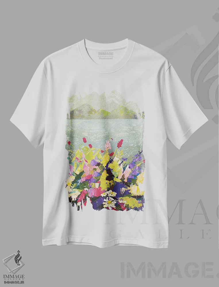 تی شرت «گل های وحشی مقابل دریاچهٔ کوهستانی»؛ رنگ های چهارفصل در یک قاب