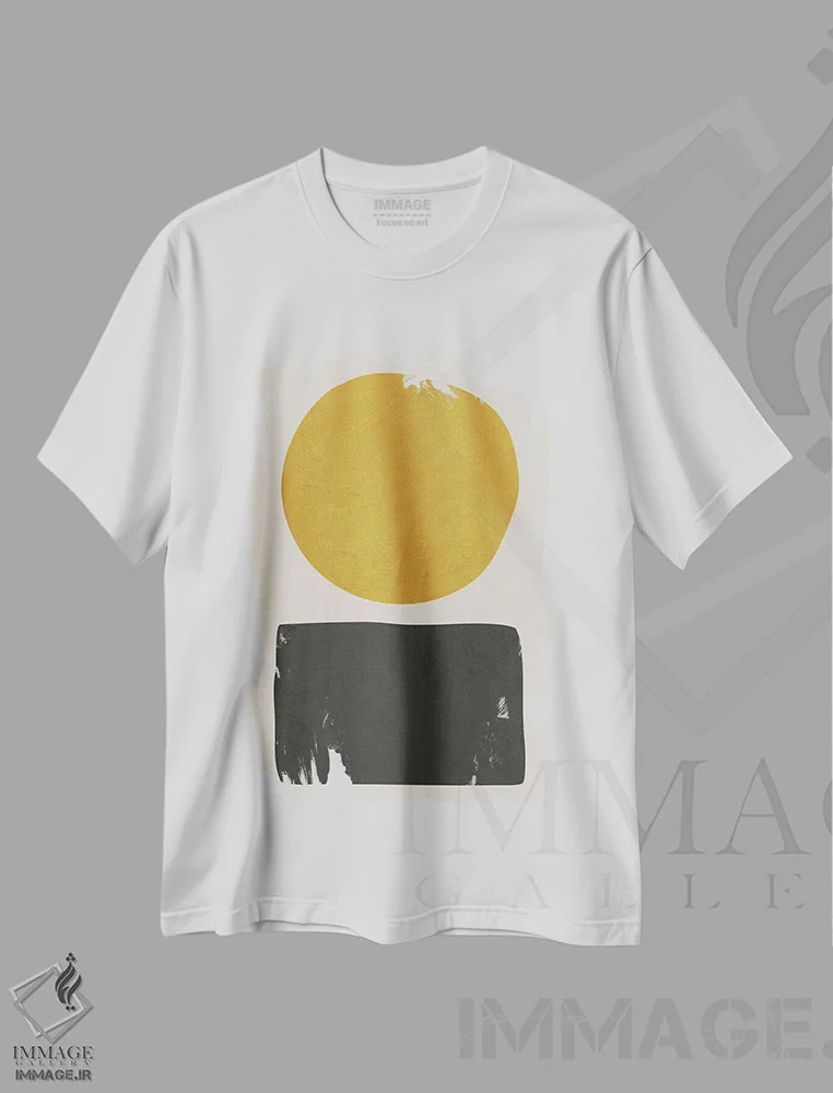 تیشرت سفید طرح دار دایره خردلی و بلوک سیاه اثر ام سی دیزاین لب | immage.ir