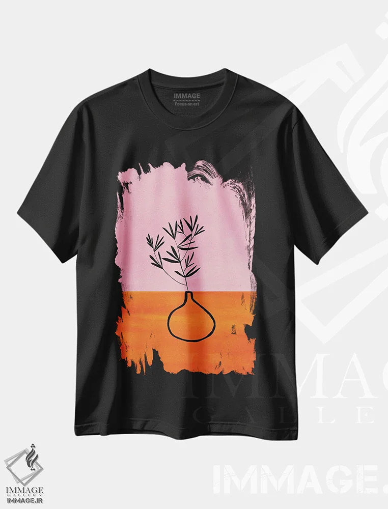 تیشرت مشکی طرح دار گیاه آپارتمانی صورتی و نارنجی، آبستره اثر ان شیپ | immage.ir