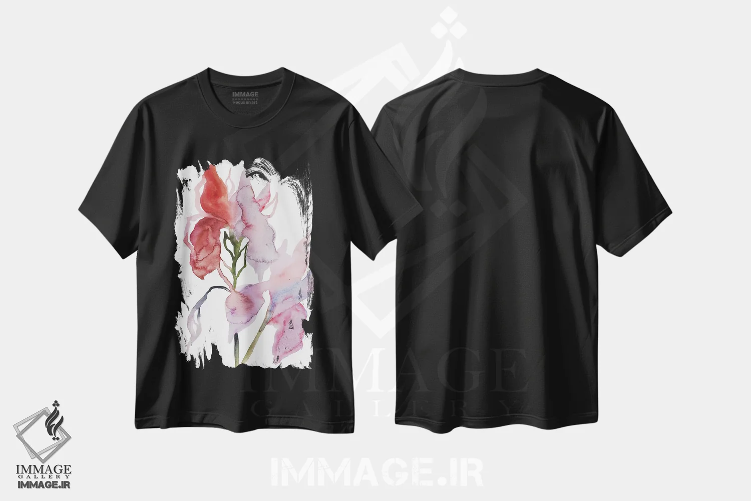 تیشرت مشکی طرح دار دو گل زنبق شمارهٔ ۳، هنر فاخر معاصر اثر الیزابت بکر | فروشگاه ایماژ