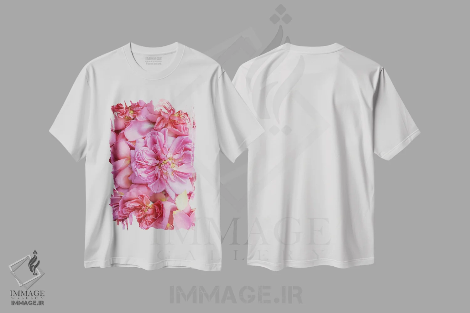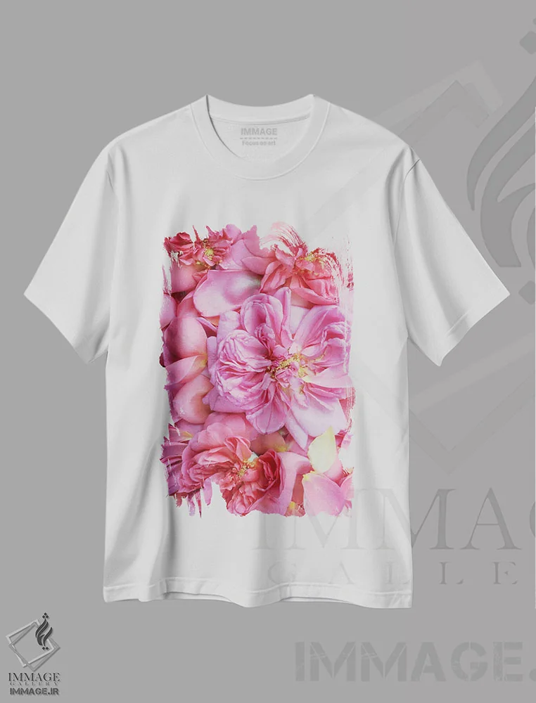 تیشرت سفید طرح دار گلبرگ های رز انگلیسی صورتی دو، مدیوم اثر آلیسون فنل | immage.ir