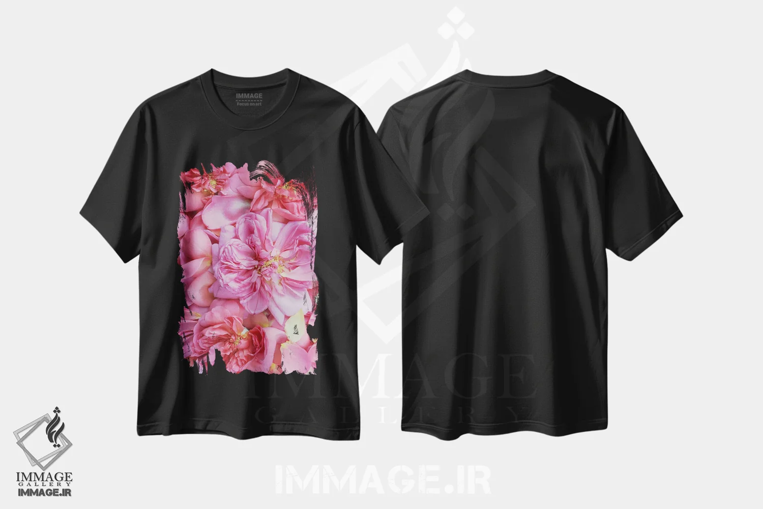 تیشرت مشکی طرح دار گلبرگ های رز انگلیسی صورتی دو، مدیوم اثر آلیسون فنل | فروشگاه ایماژ