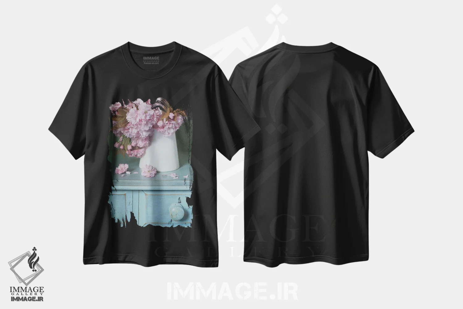 تیشرت مشکی طرح دار شکوفه گیلاس در پارچ سفید، مدیوم اثر آلیسون فنل | فروشگاه ایماژ