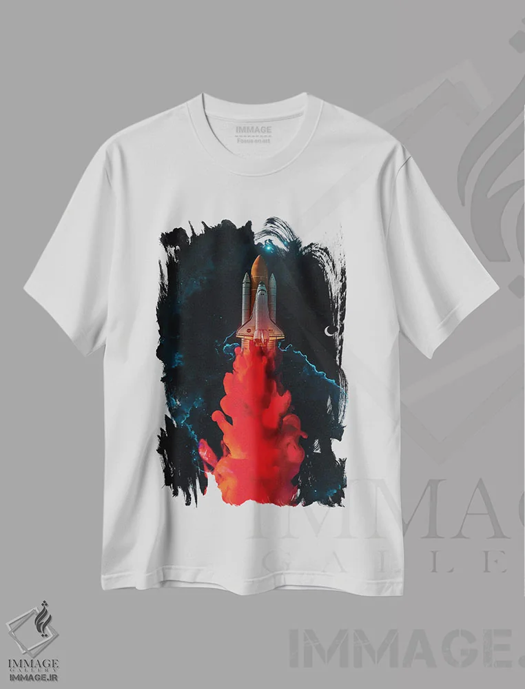 تیشرت سفید طرح دار پرتاب راکت جوهری قرمز در شب آبی، عکاسی ترکیبی اثر جن زد | immage.ir