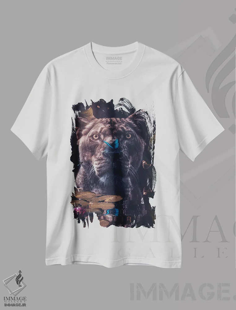 تیشرت طرح دار شیر ماده وحشی در حال حمام با نیلوفرآبی و پروانه ها اثر جن زد