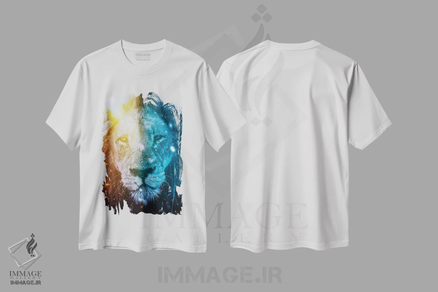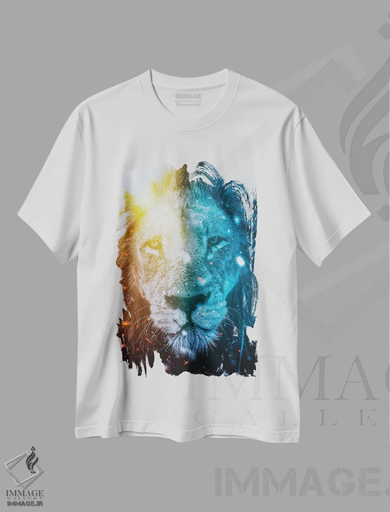تیشرت سفید طرح دار شیر پادشاه عناصر آتش و یخ، عکاسی ترکیبی اثر جن زد | immage.ir