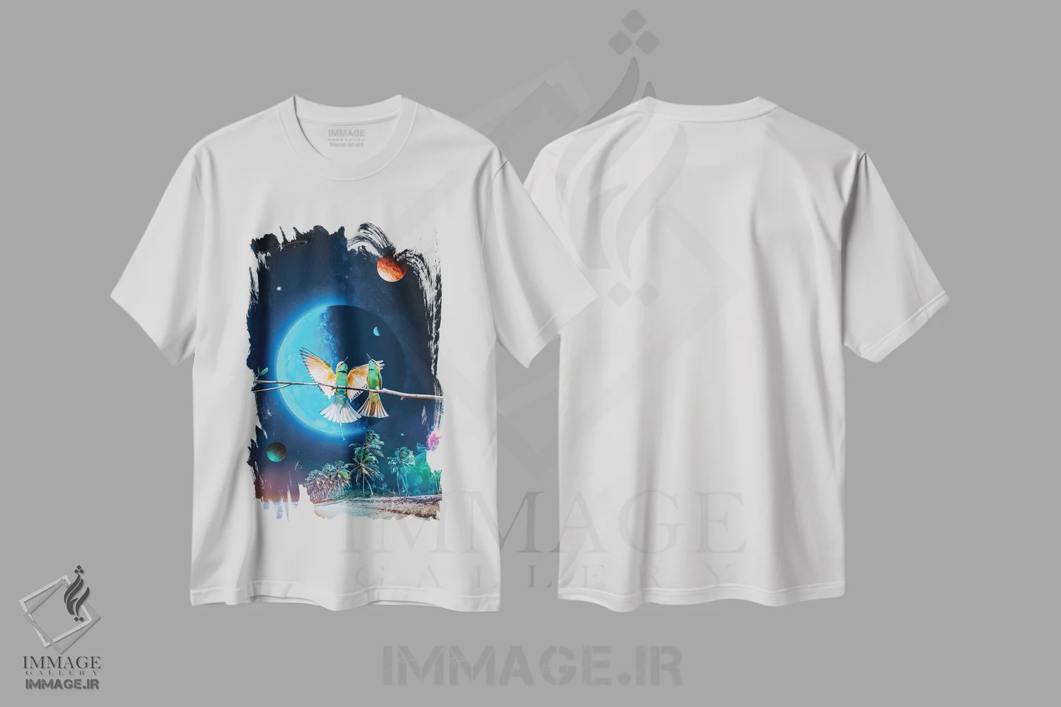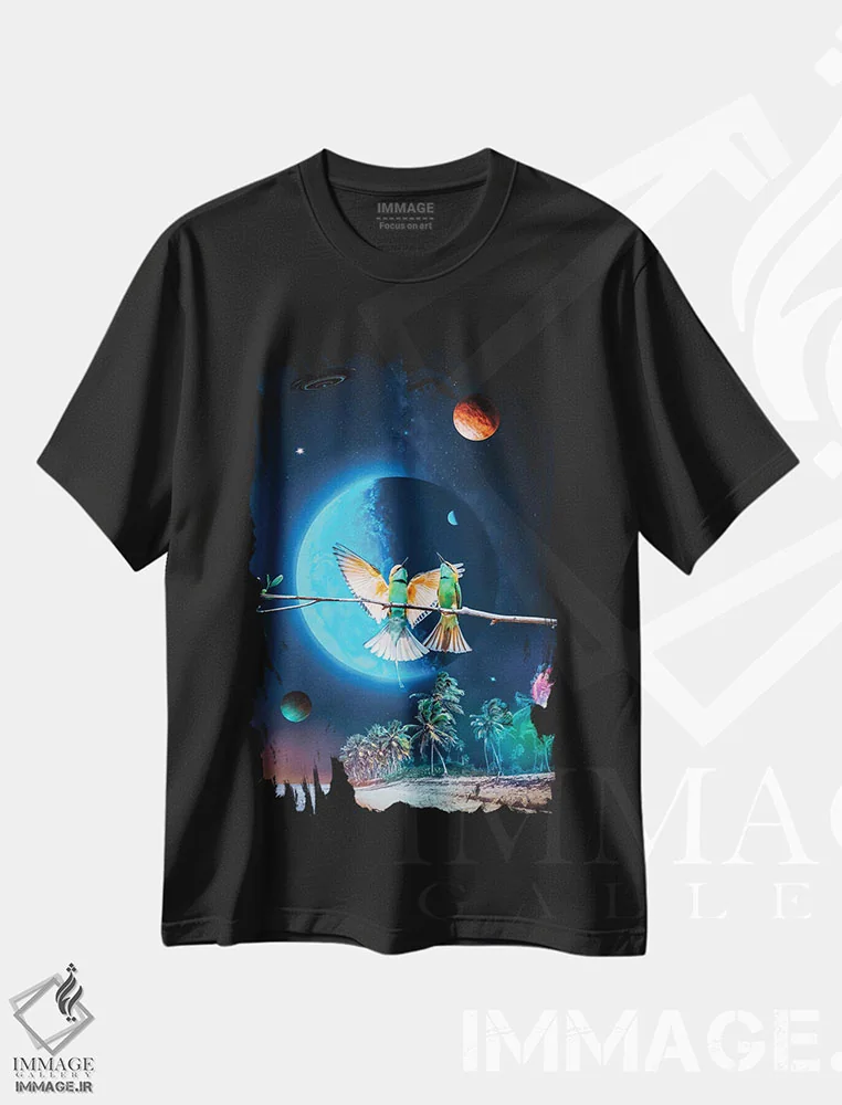 تی شرت هنری «پرندگان ساحل گرمسیری و آسمان پرستاره»؛ ترکیب طبیعت و سورئال فضایی